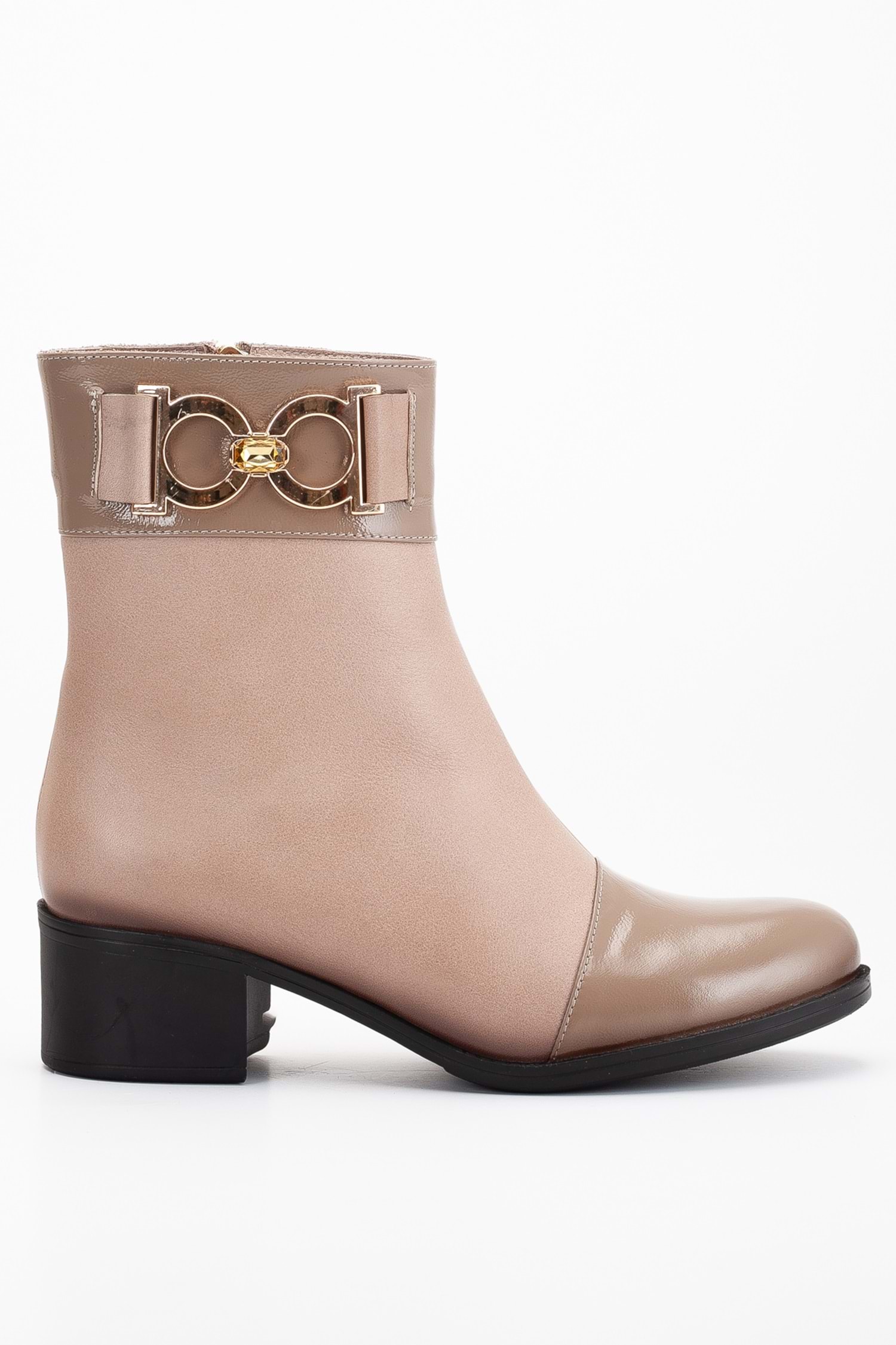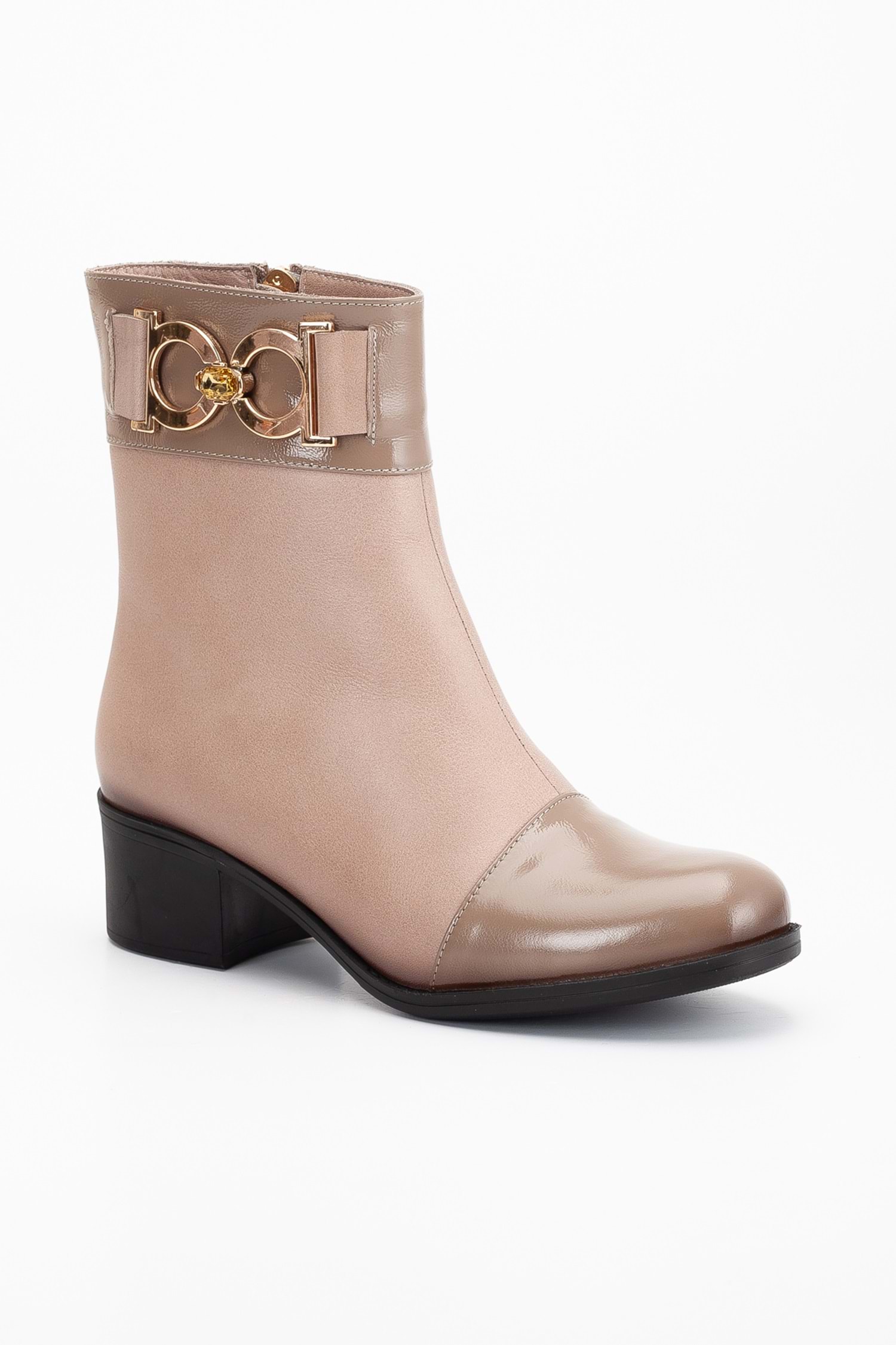Kadın Hakiki Deri Aksesuarlı Rugan Detaylı Kısa Topuklu Bot - Taş