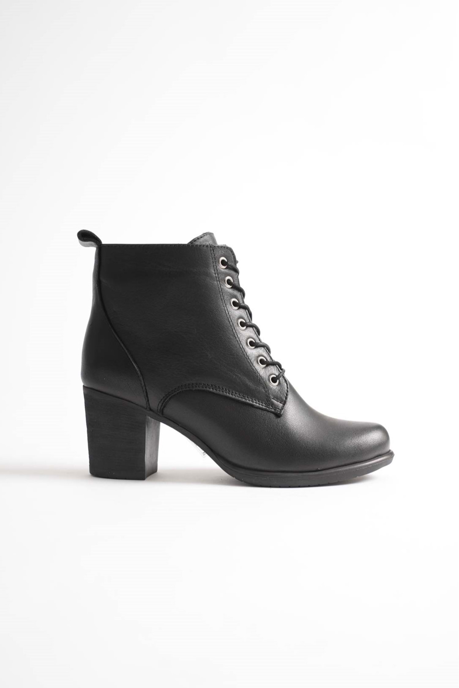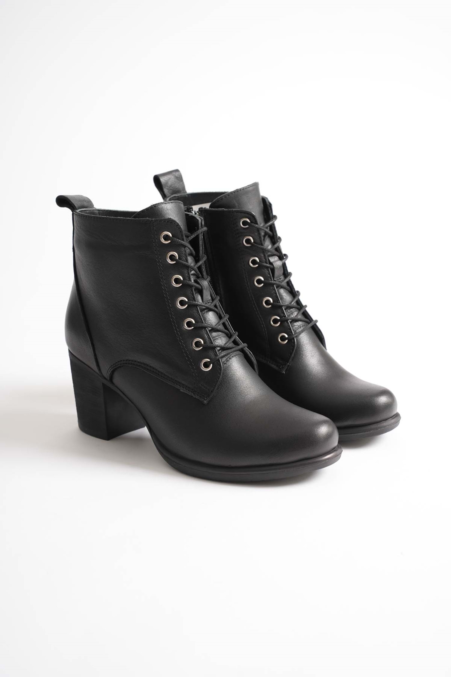 Kadın Hakiki Deri Bağcıklı Topuklu Bot - Siyah
