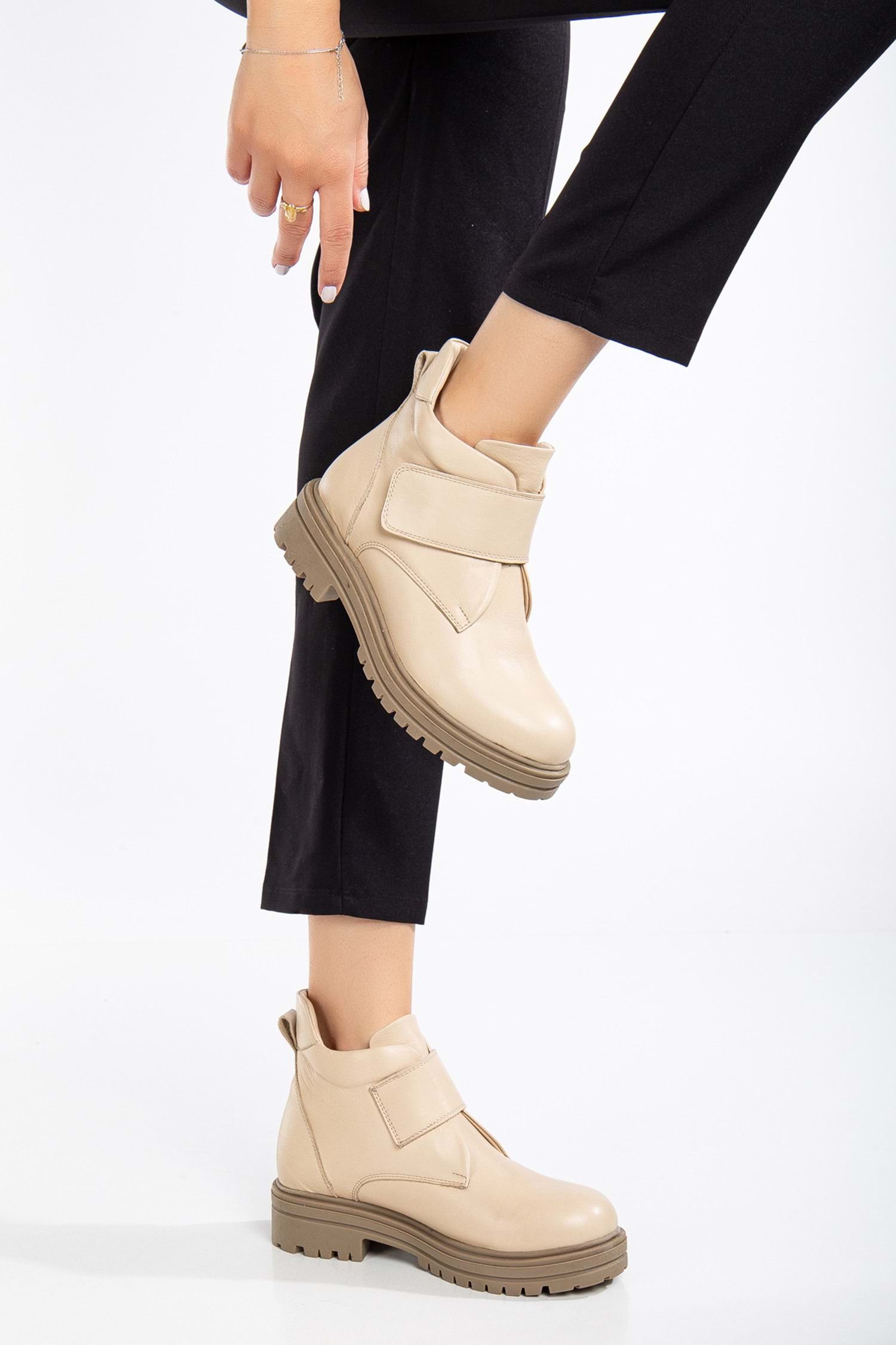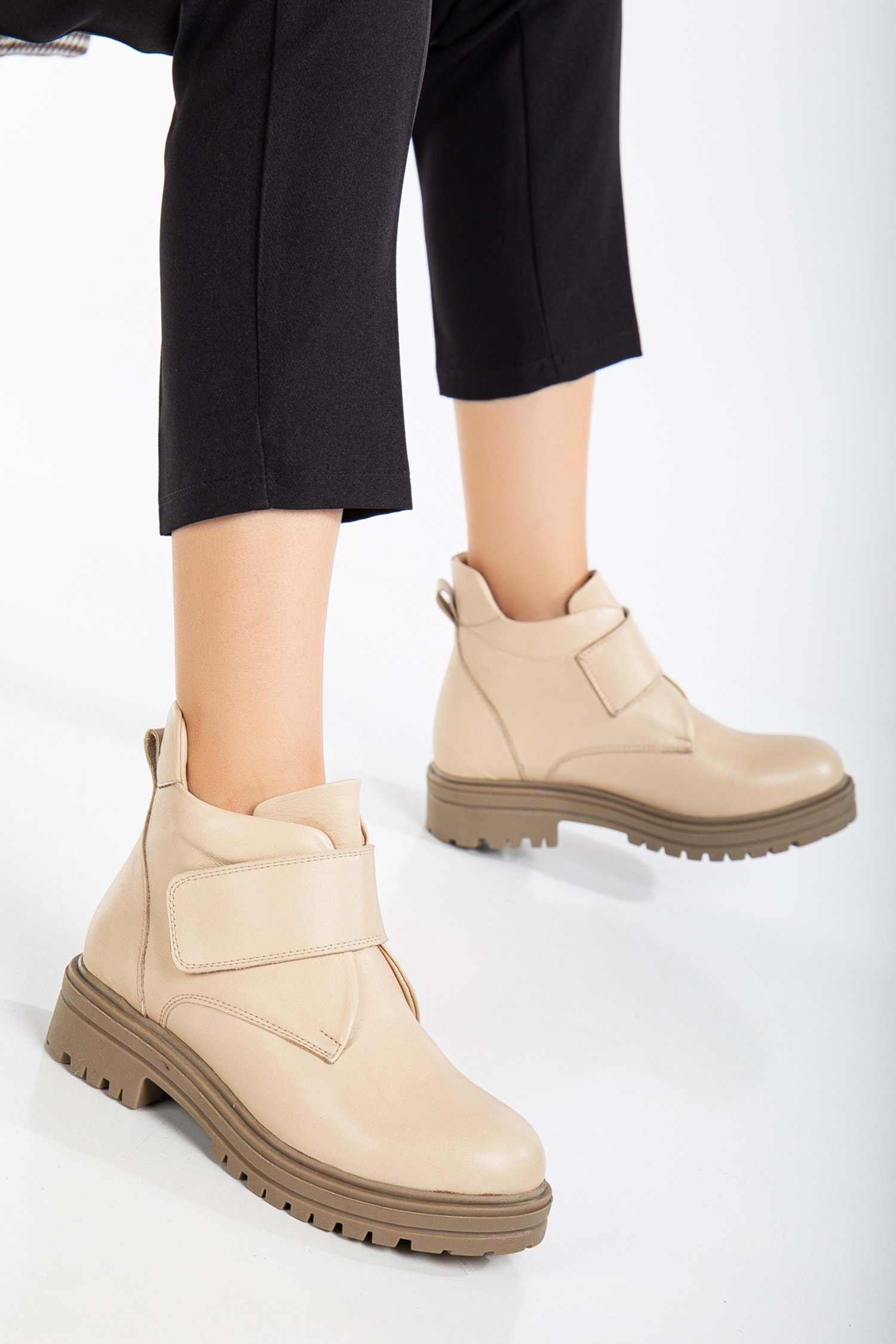 Kadın Hakiki Deri Cırtlı Kolay Giyim Günlük Bot - Bej