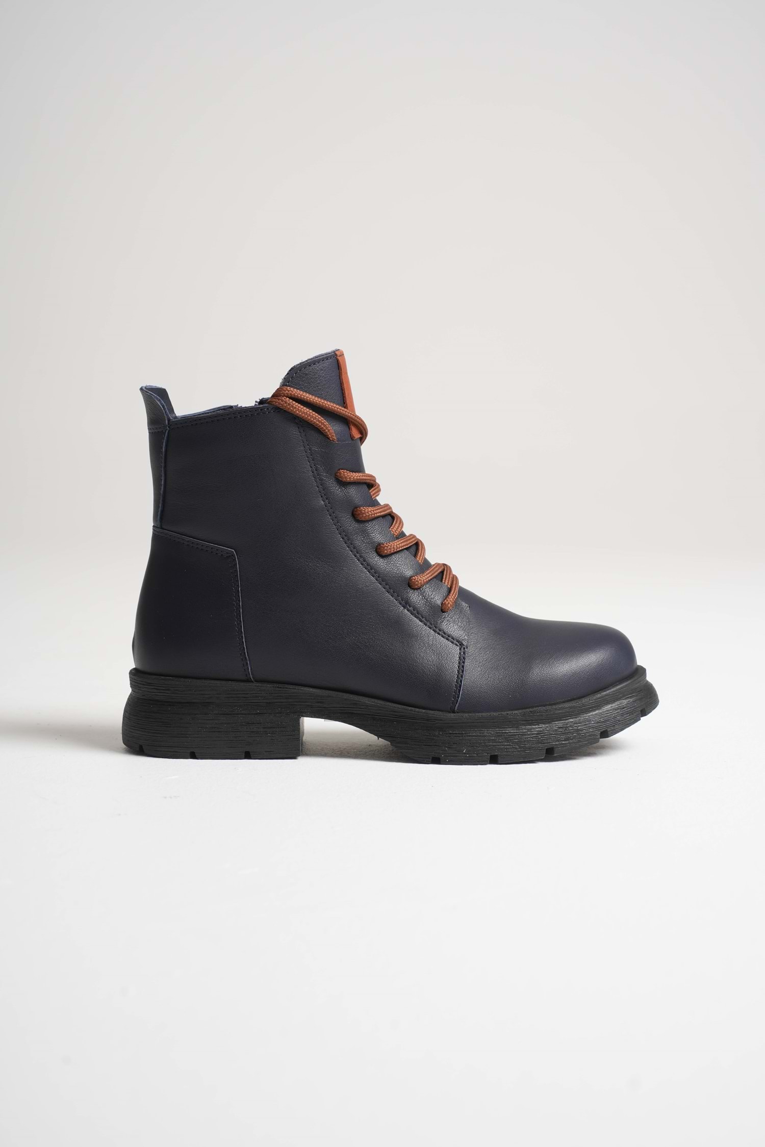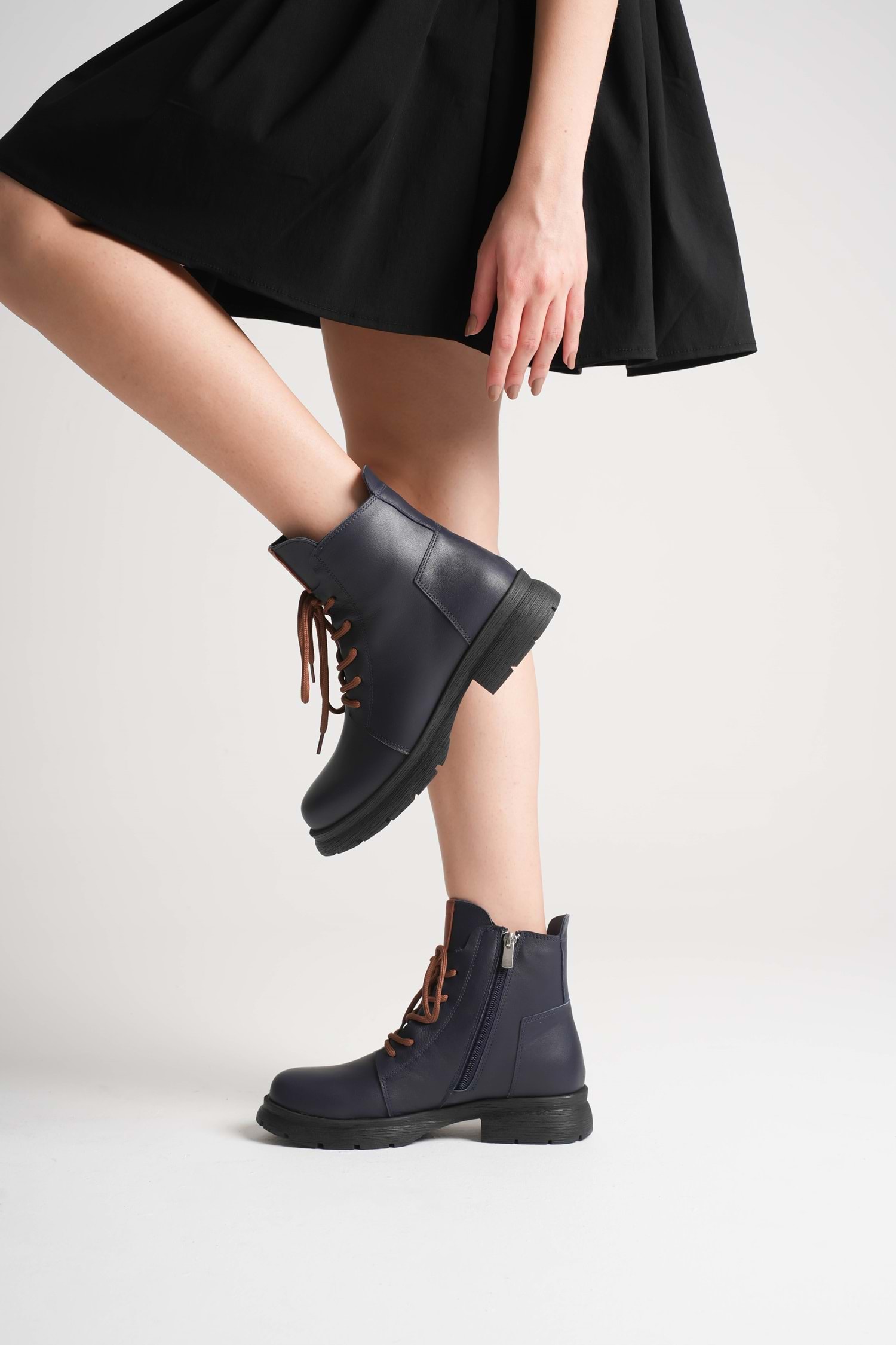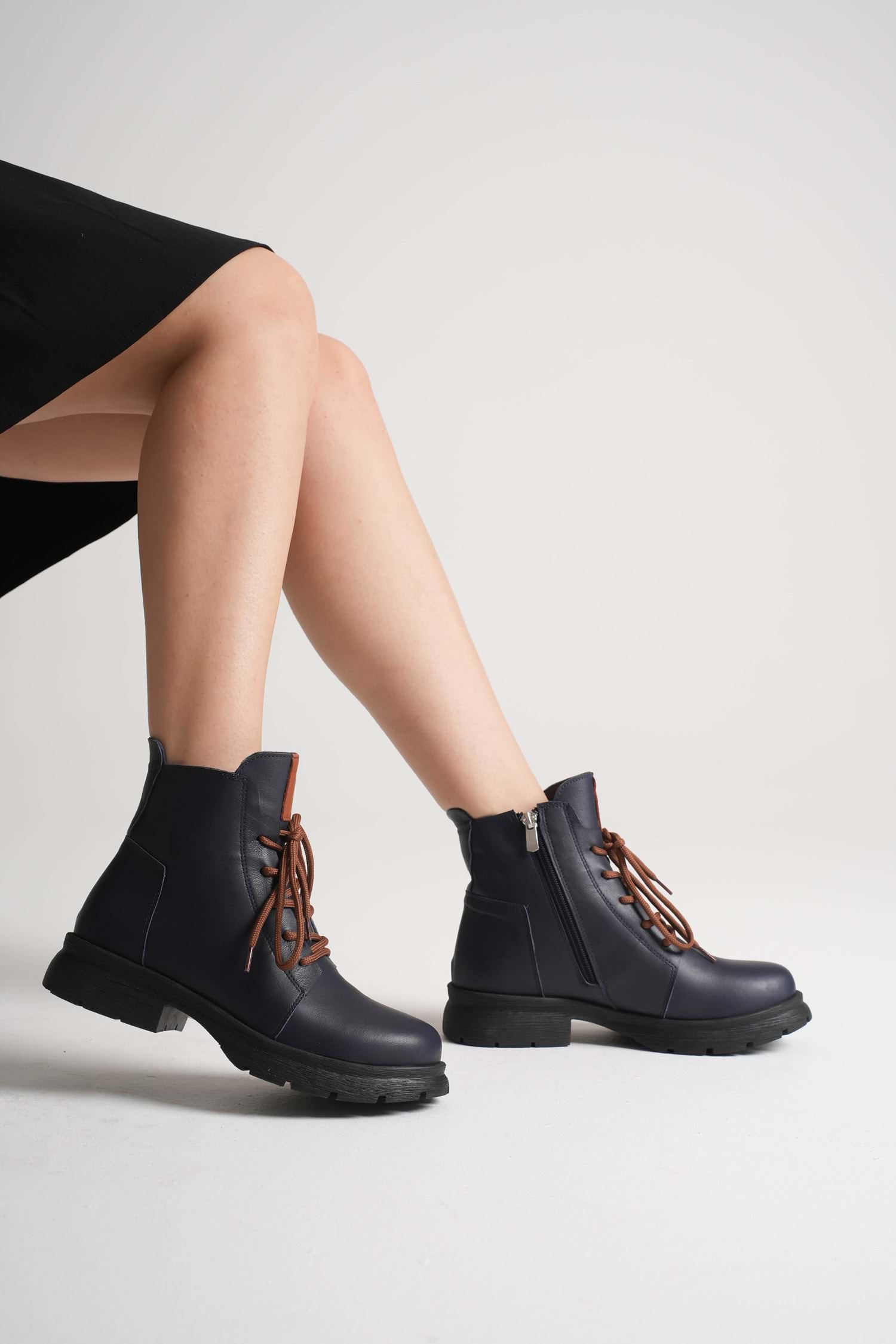 Kadın Hakiki Deri Fermuarlı Bağcıklı Günlük Bot - Lacivert