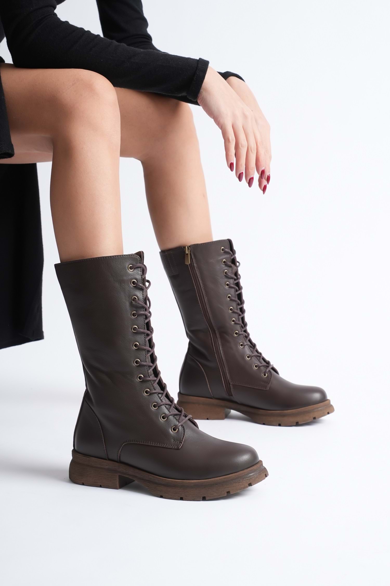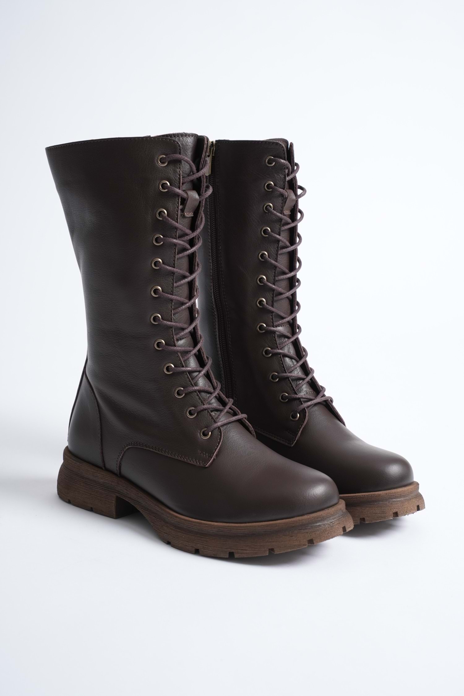Kadın Hakiki Deri Fermuarlı Bağcıklı Postal Bot - Kahve