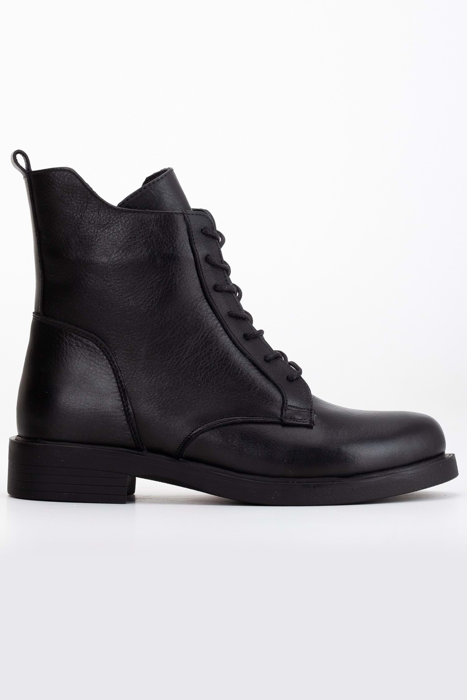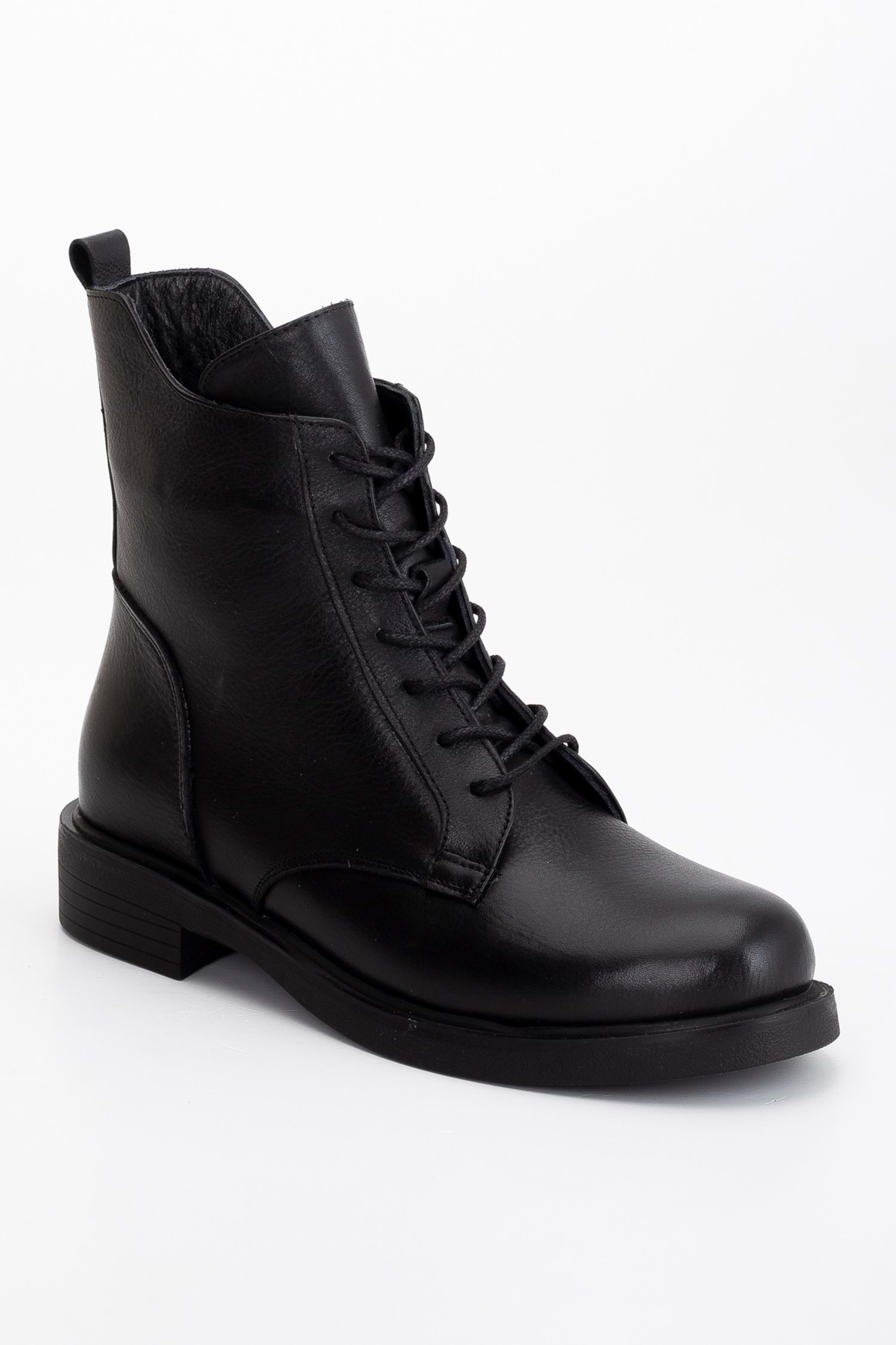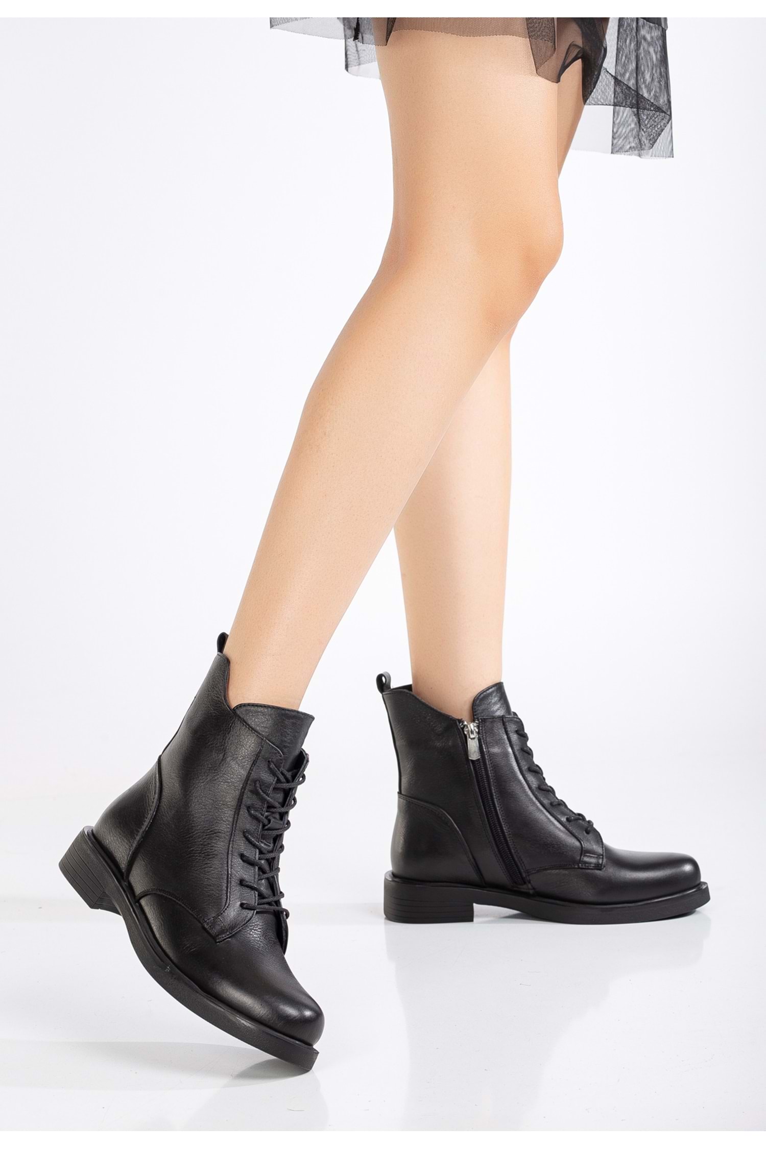 Kadın Hakiki Deri Klasik Bağcıklı Fermuarlı Bot - Siyah