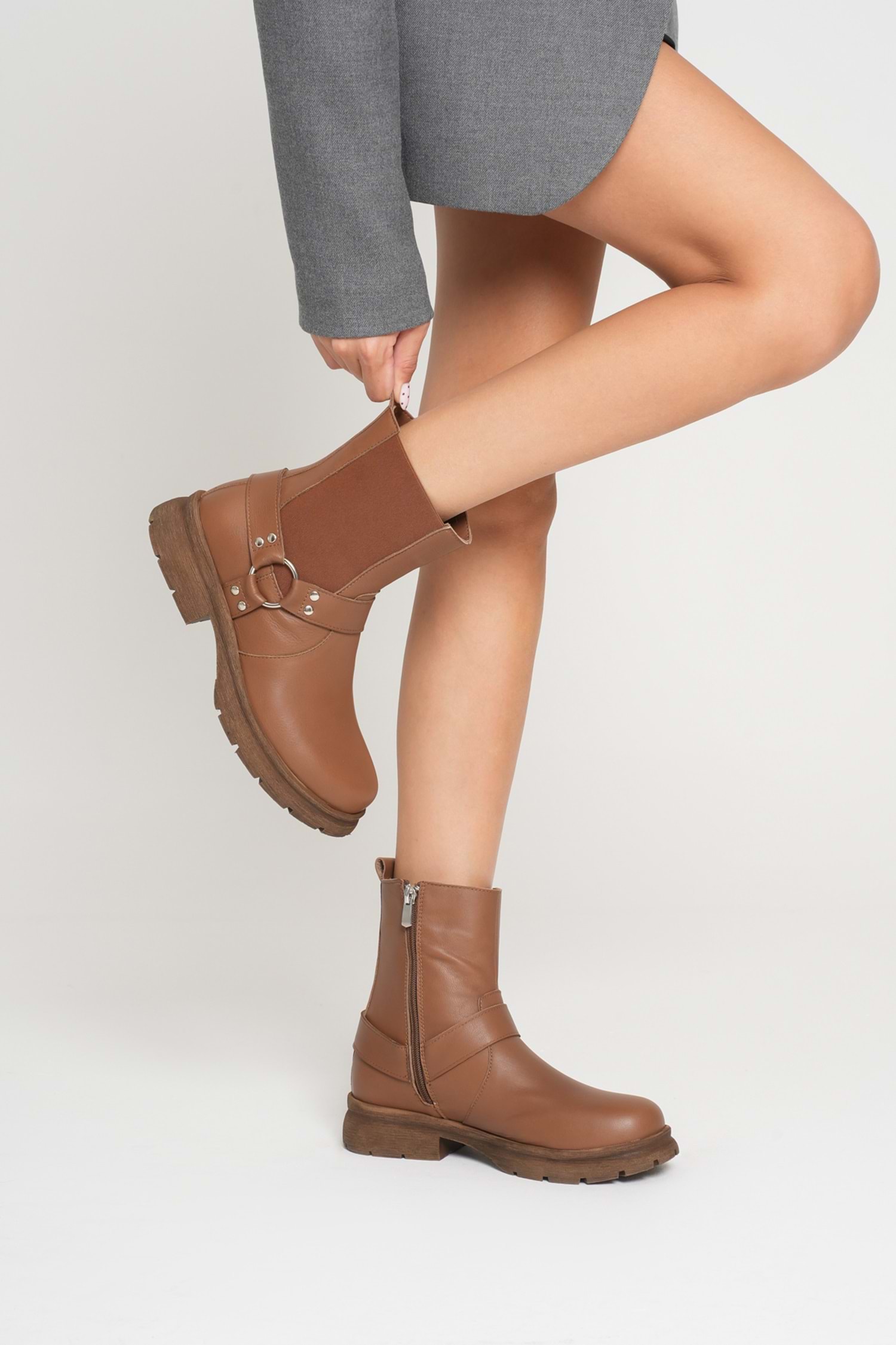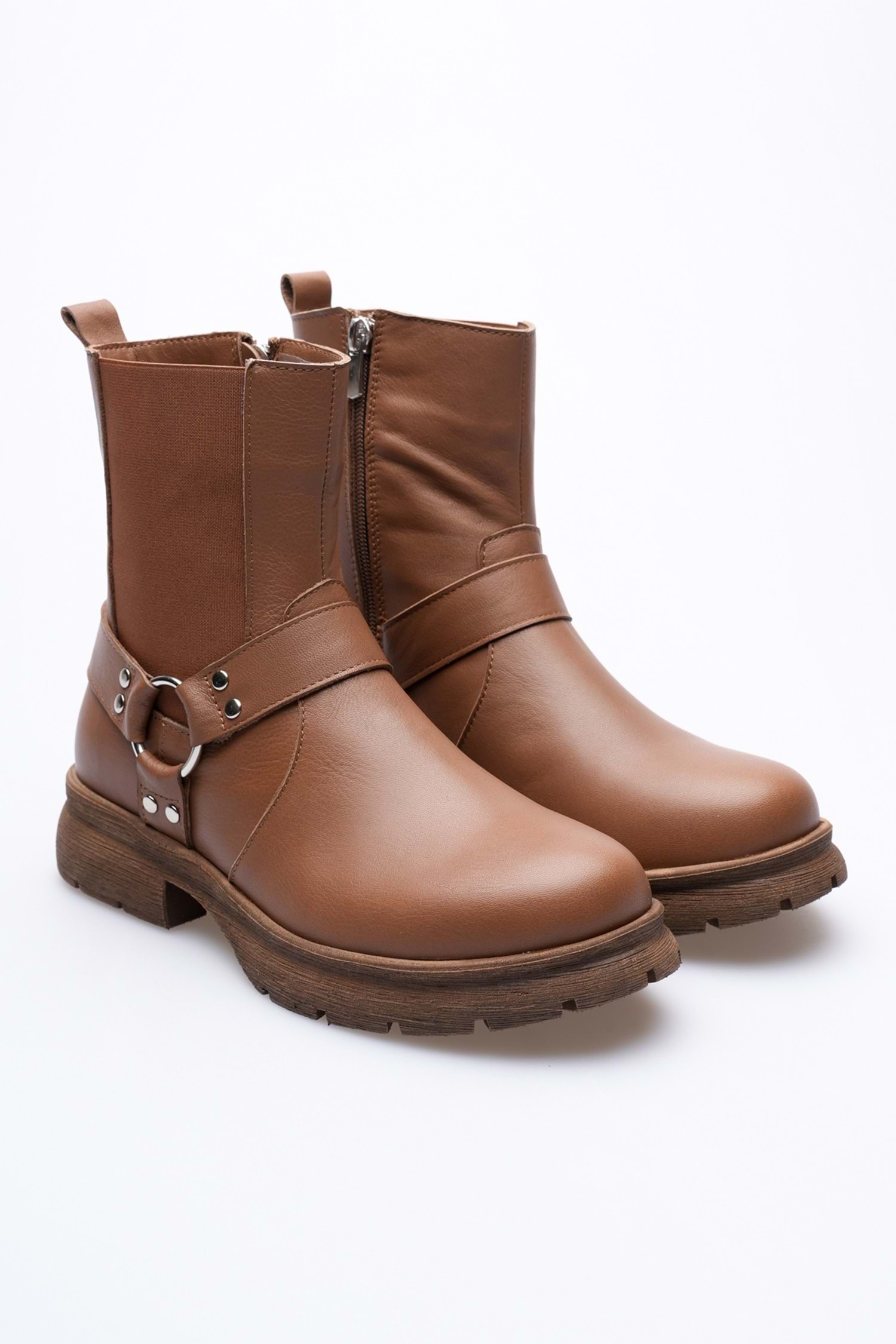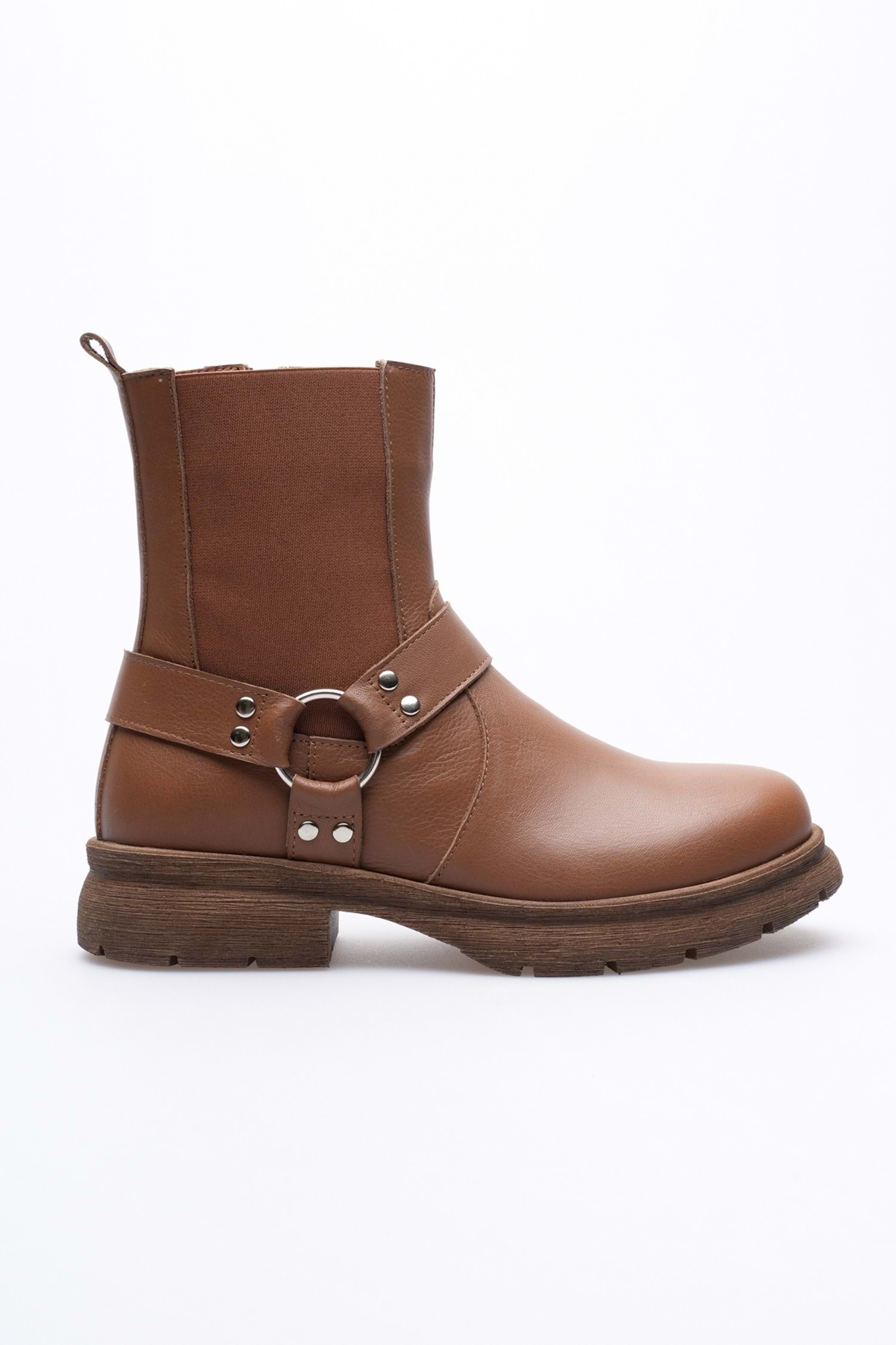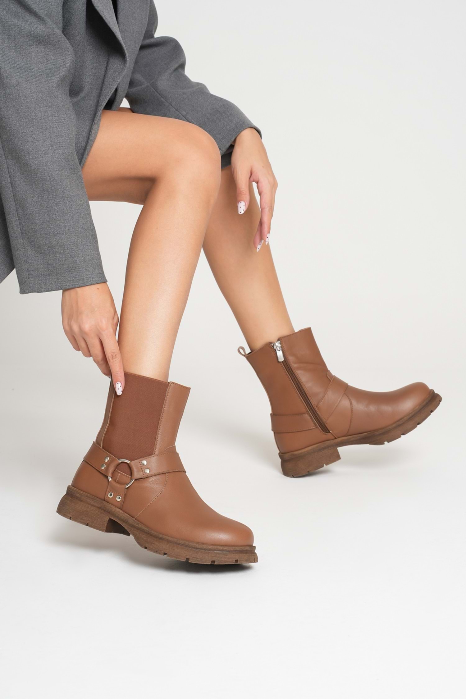 Kadın Hakiki Deri Metal Aksesuarlı Bot - Ceviz