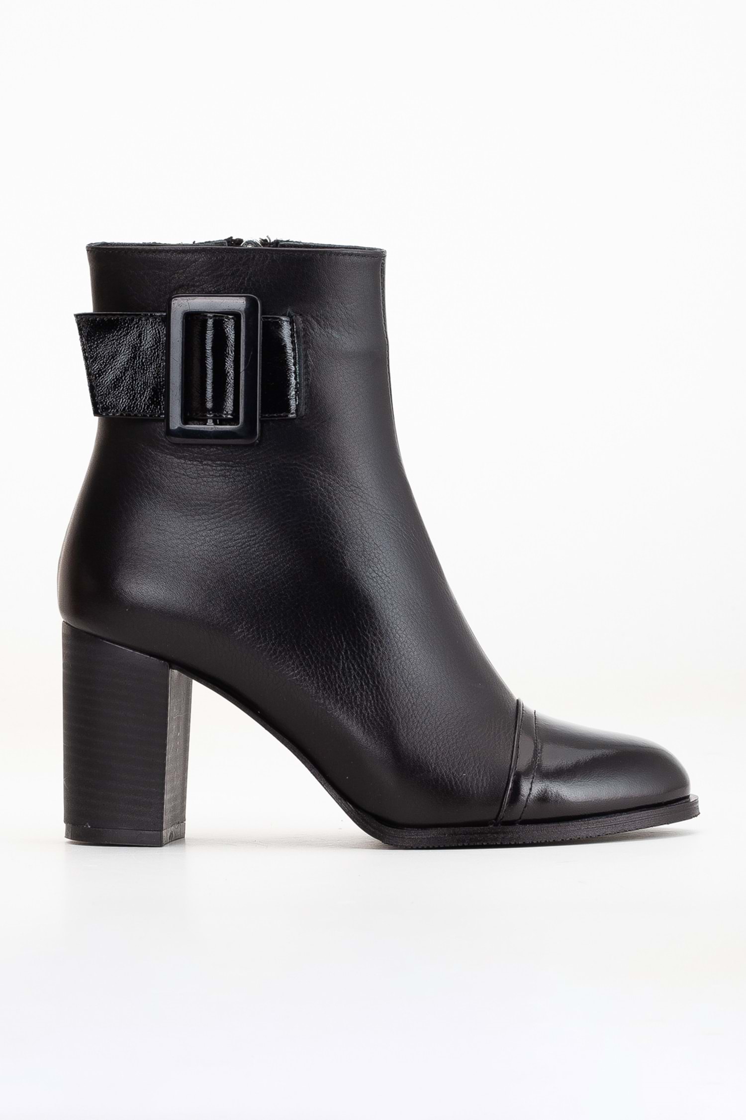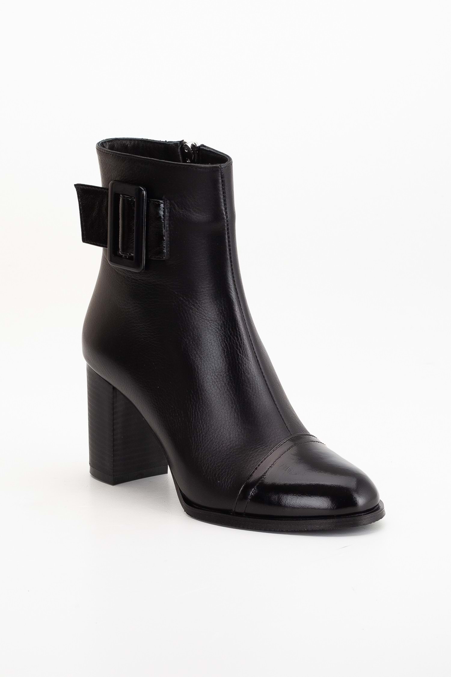 Kadın Hakiki Deri Tokalı Rugan Detaylı Topuklu Bot - Siyah Rugan