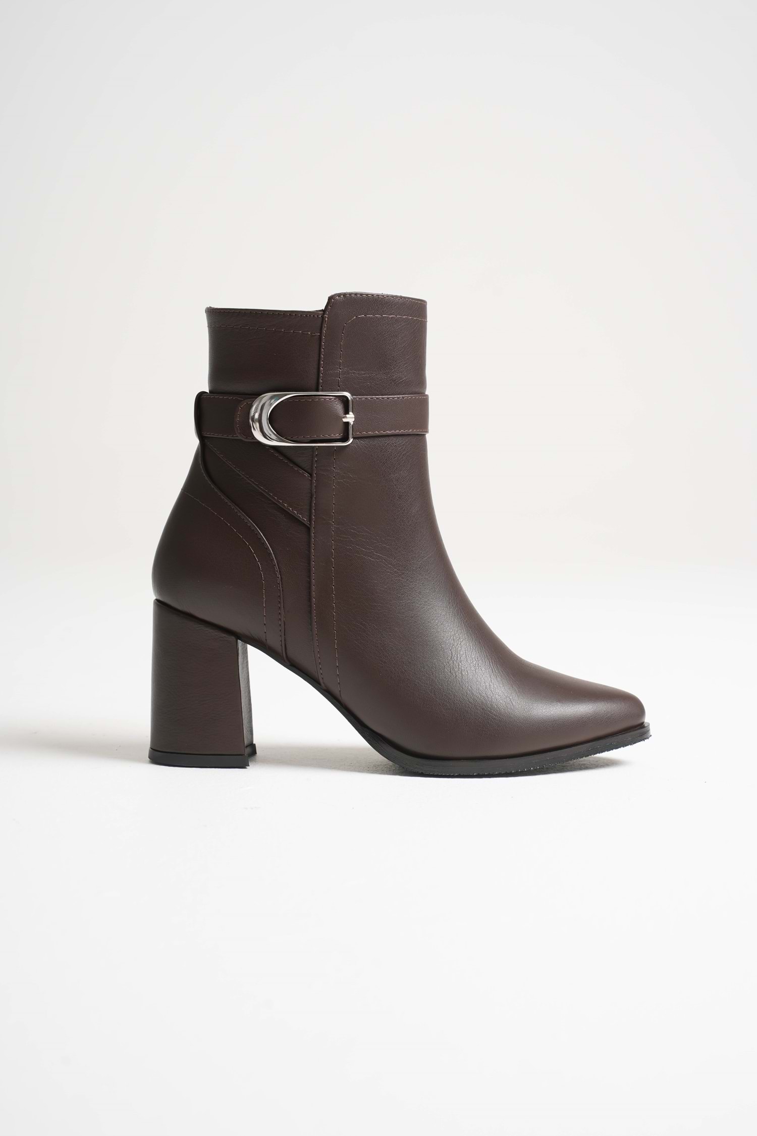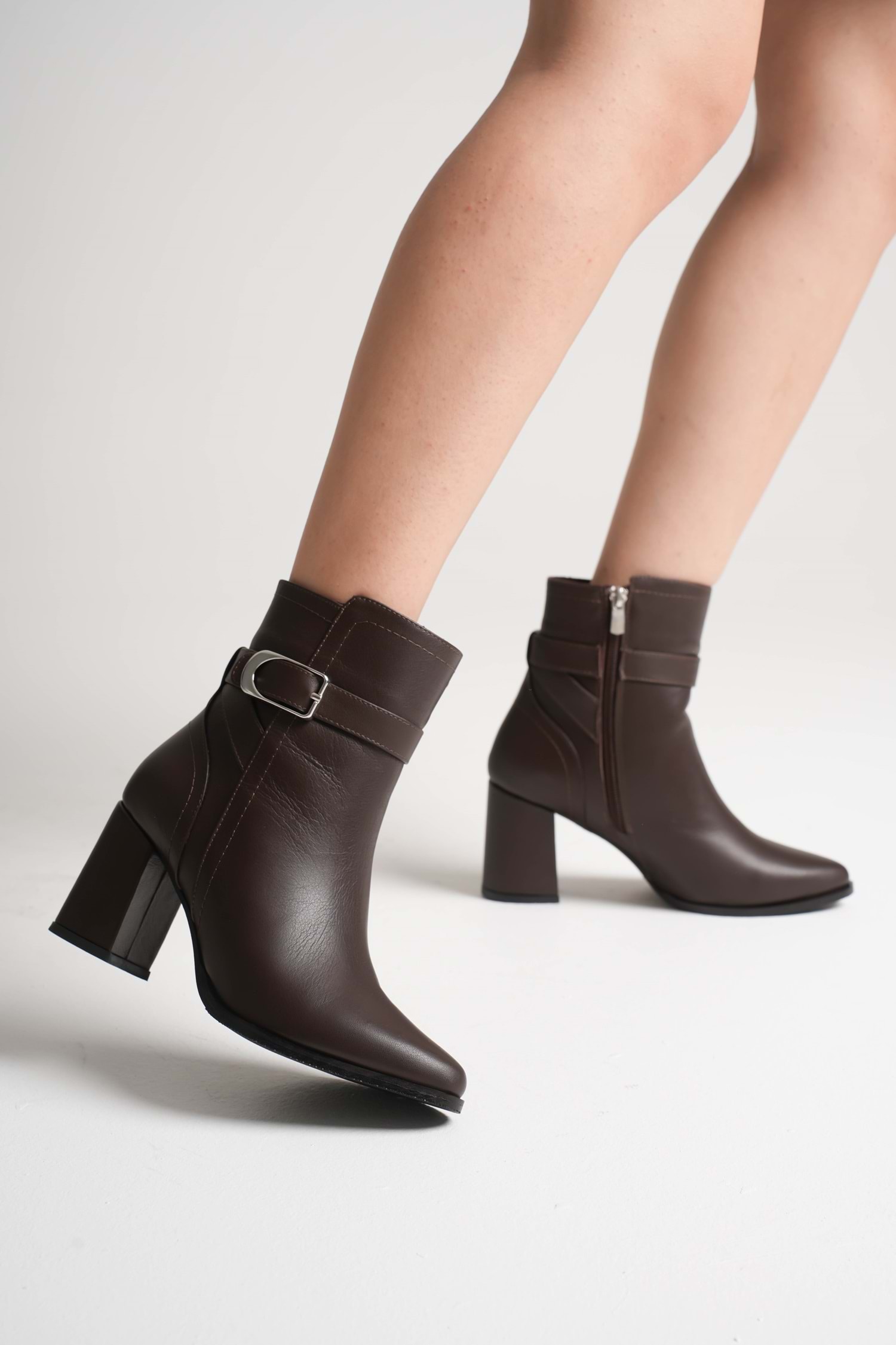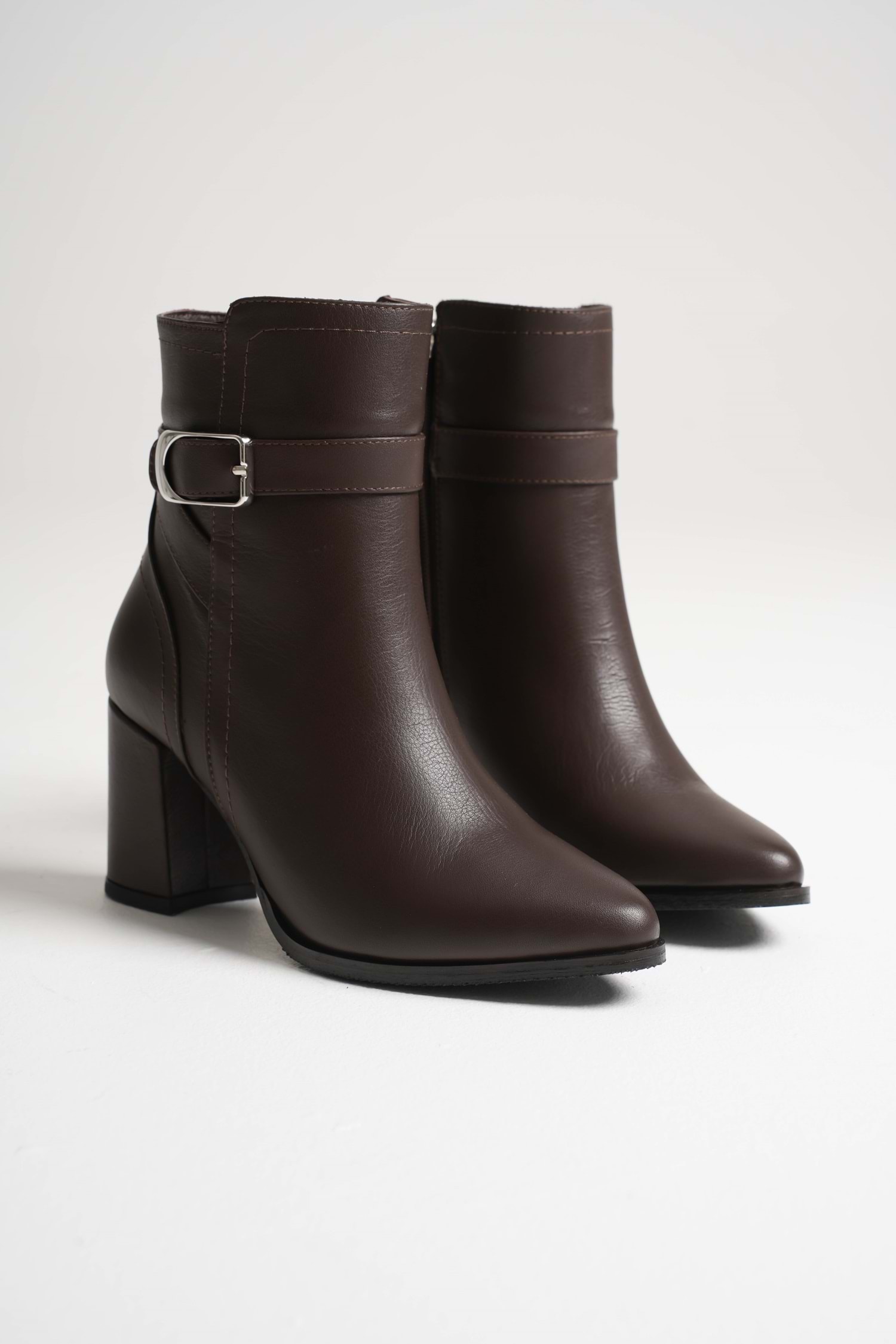 Kadın Hakiki Deri Tokalı Topuklu Bot - Kahve