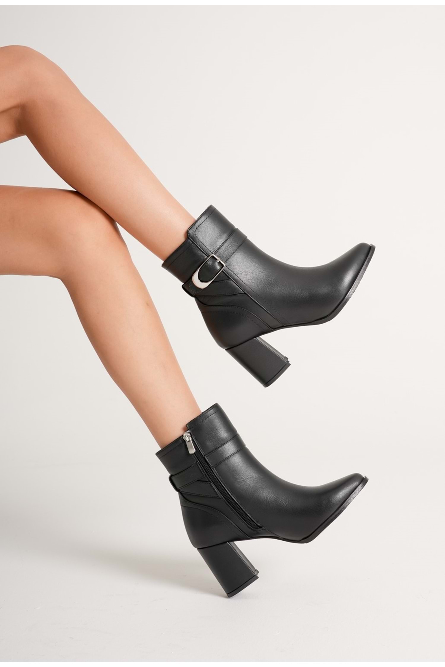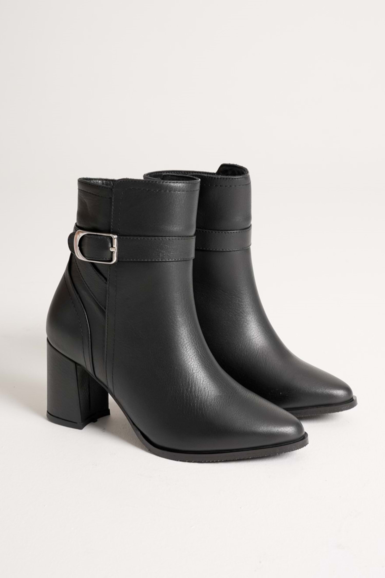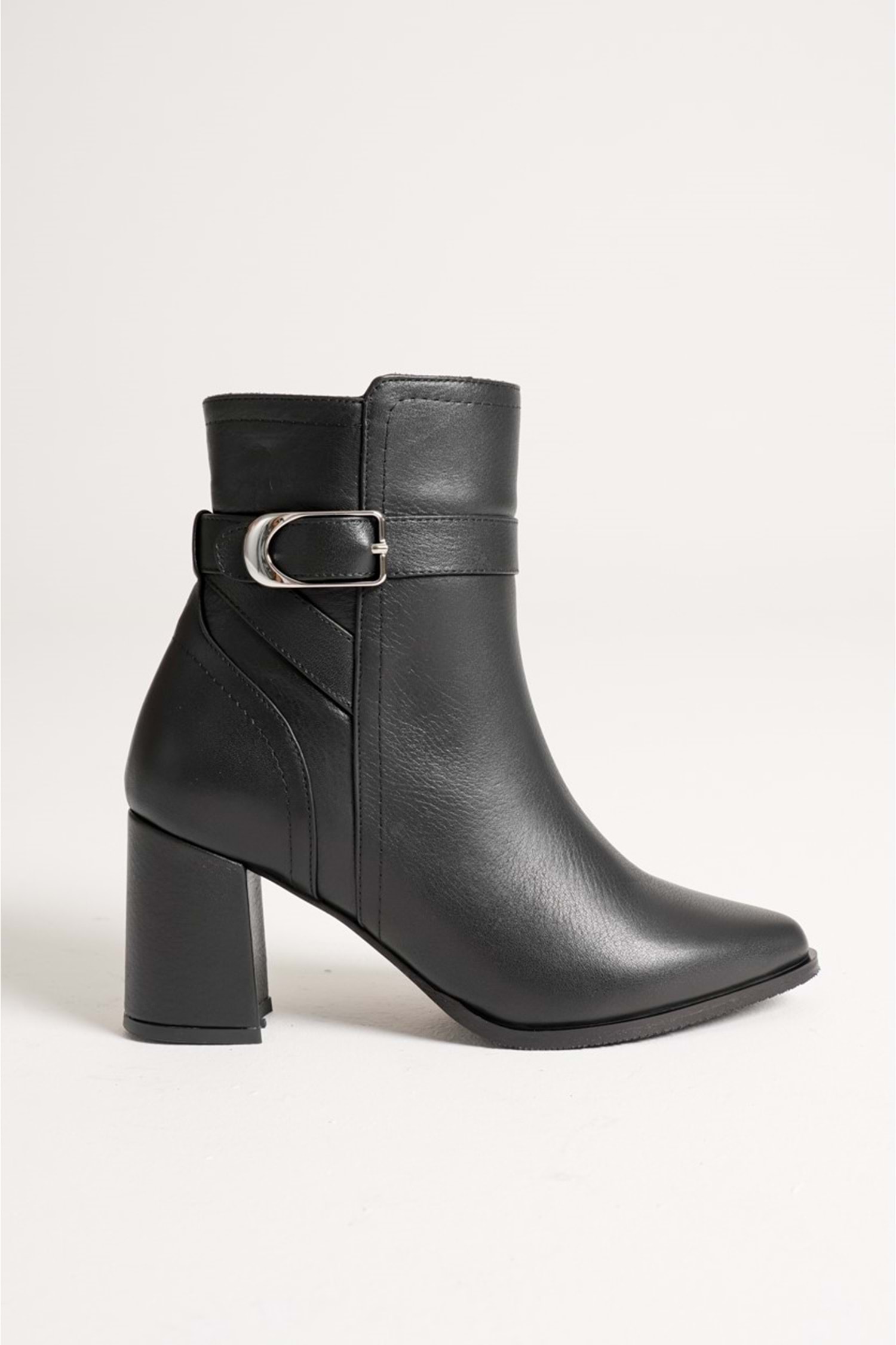 Kadın Hakiki Deri Tokalı Topuklu Bot - Siyah
