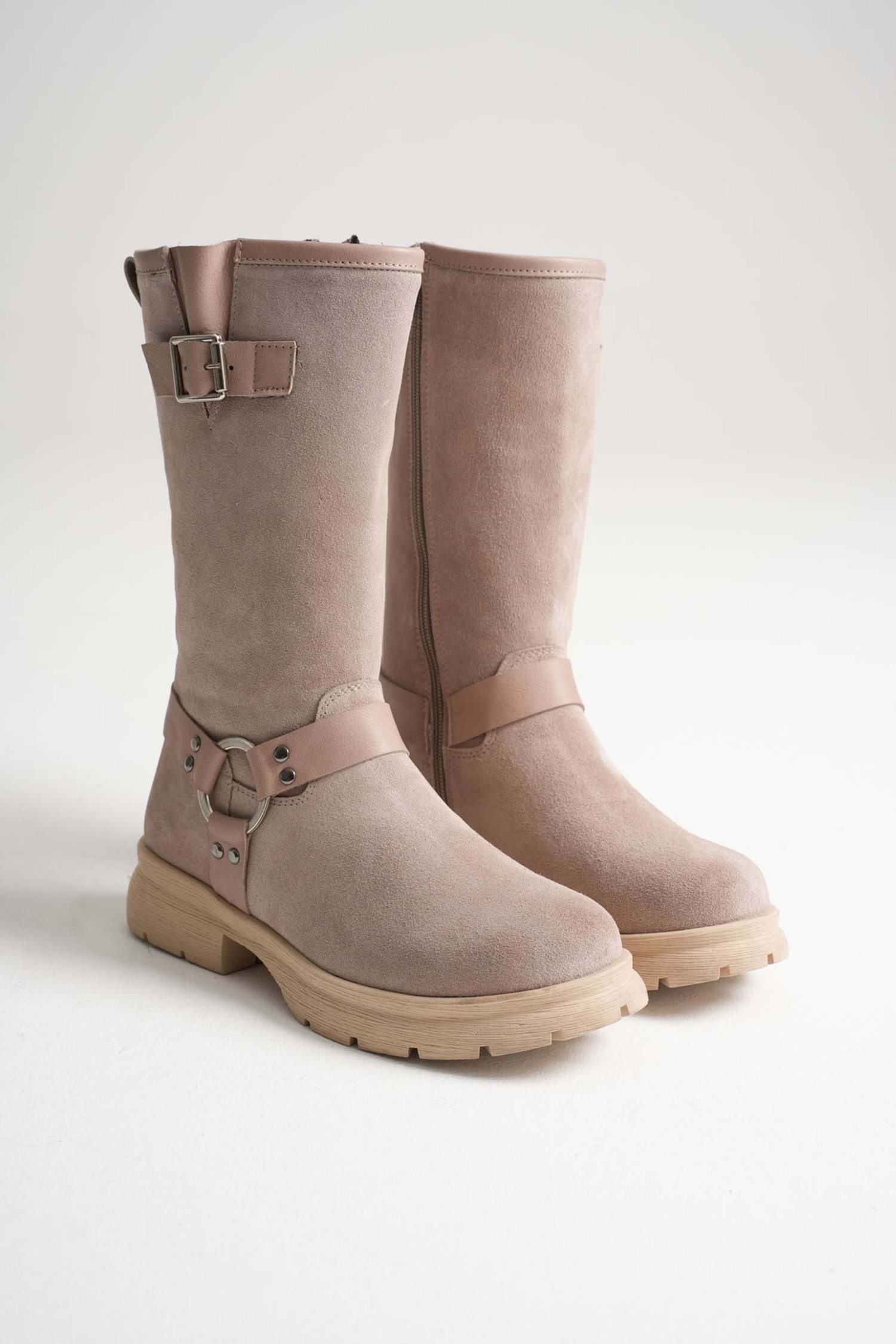 Kadın Hakiki Deri Aksesuar Detaylı Binici Çizme - Vizon Süet