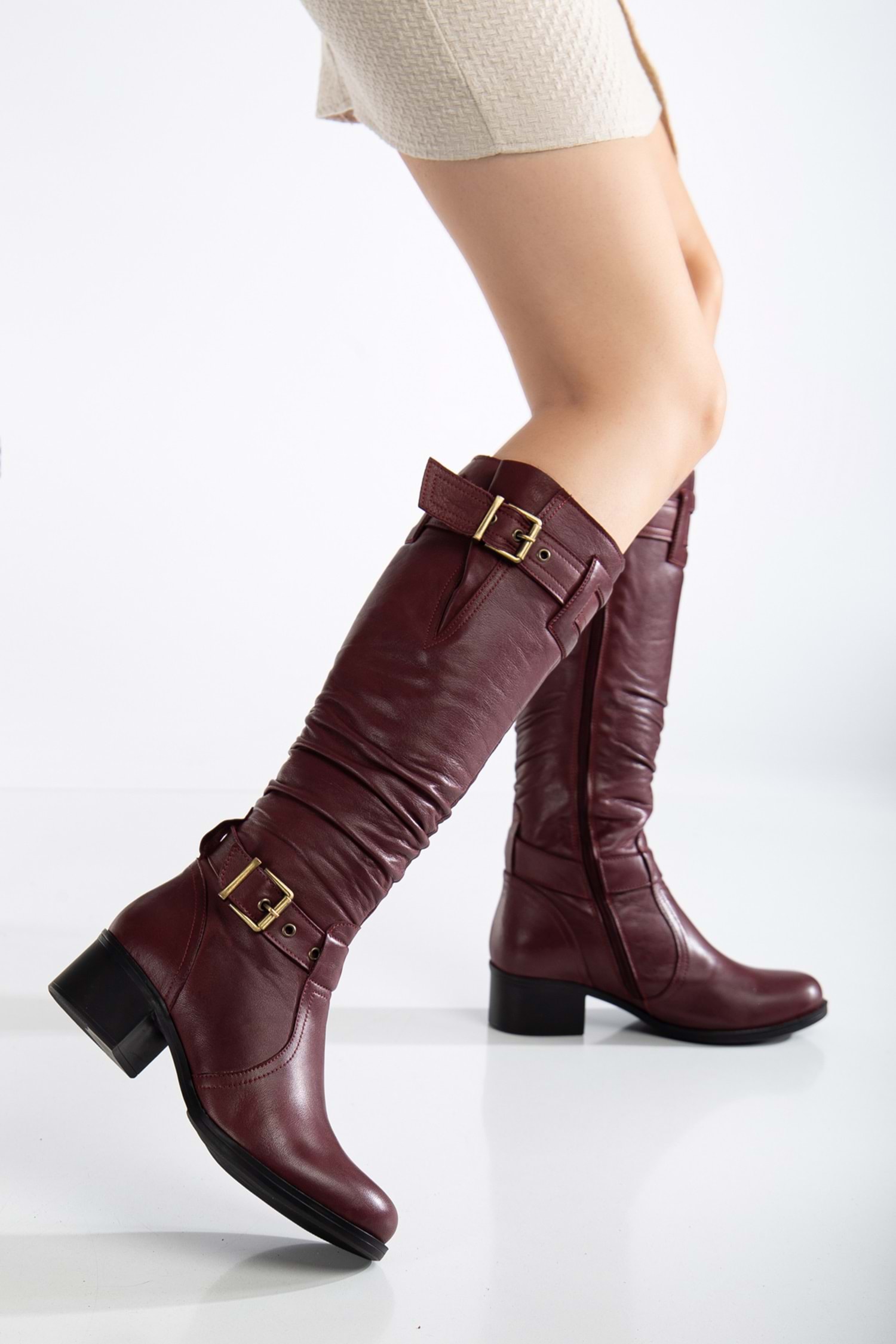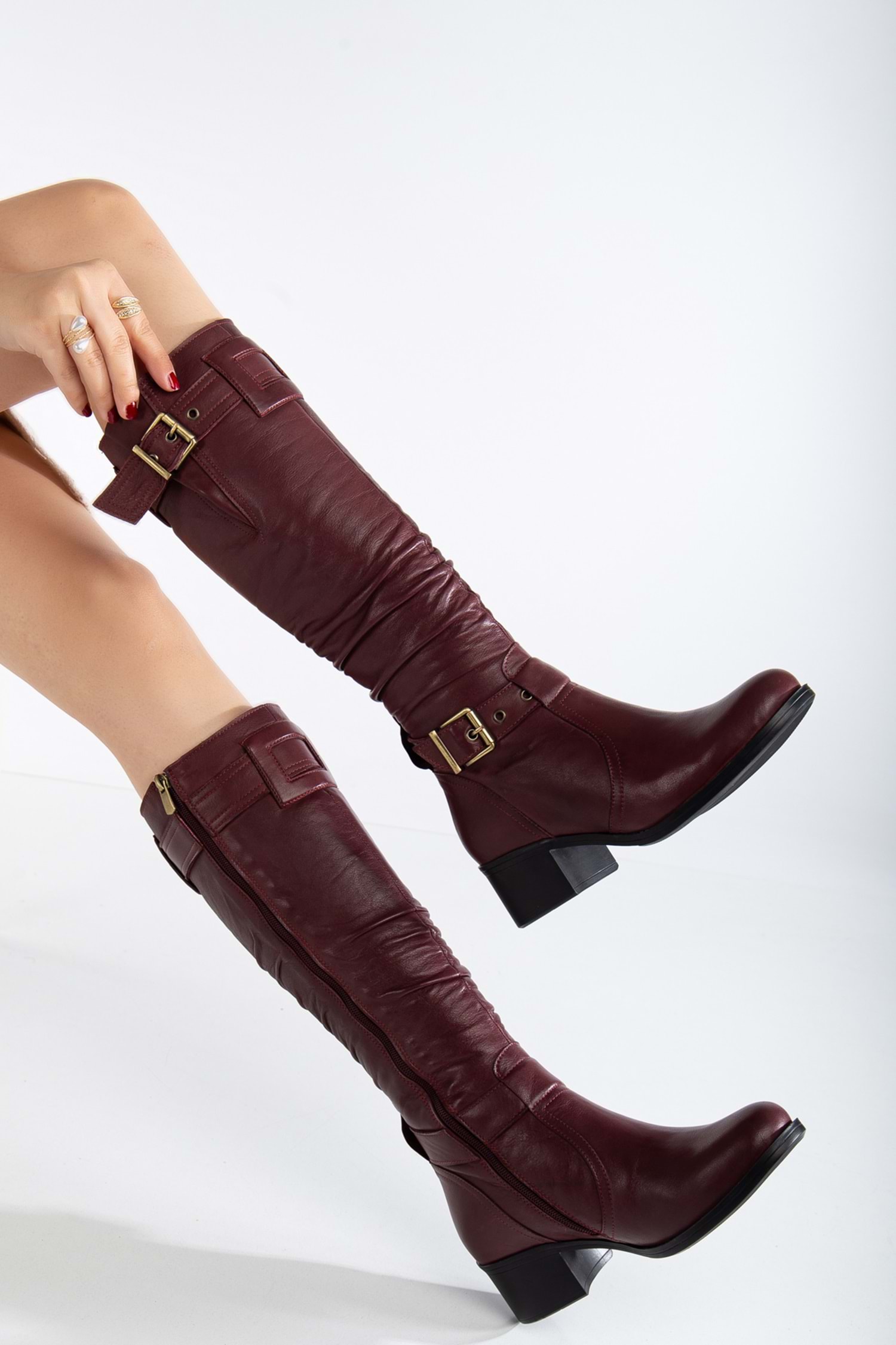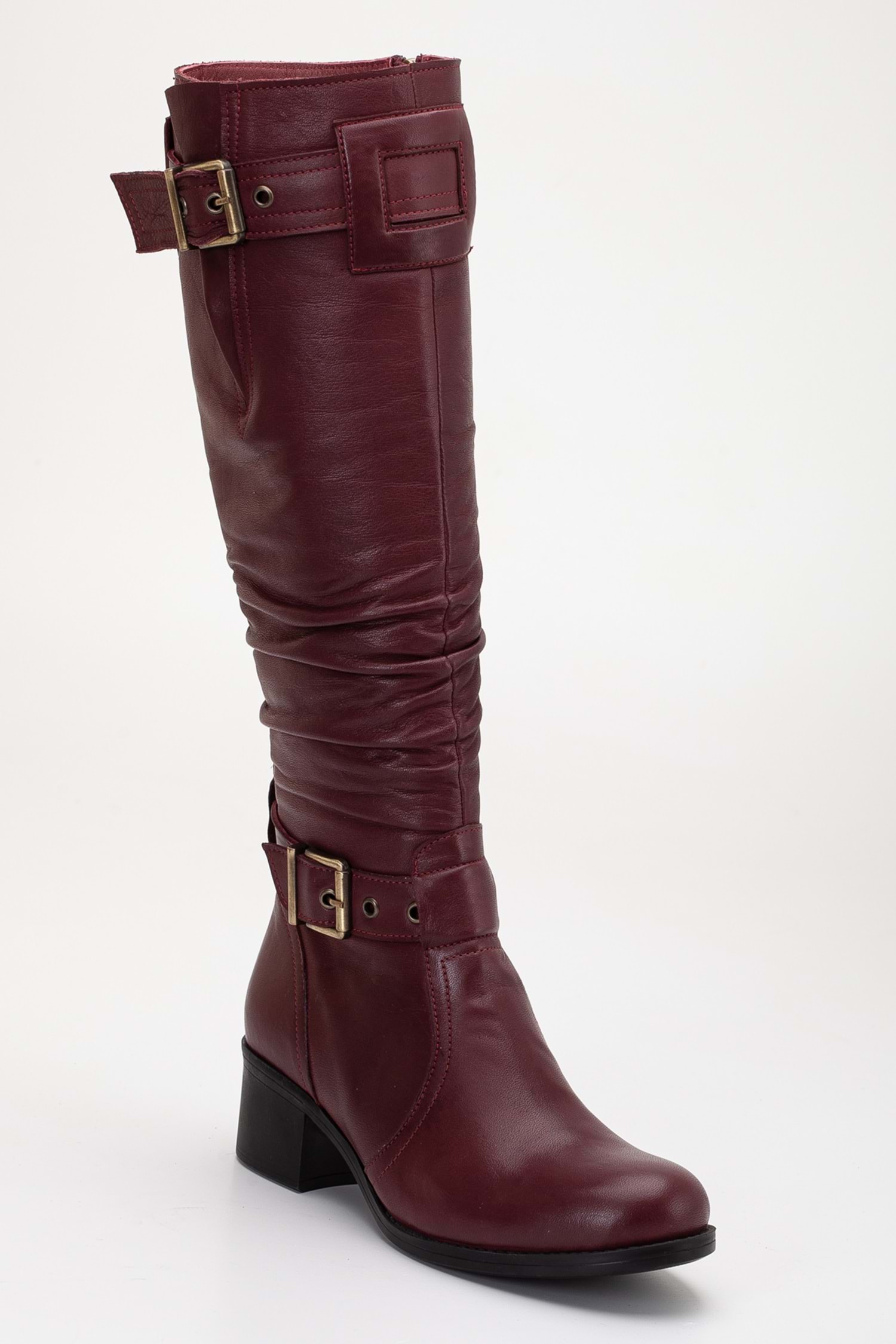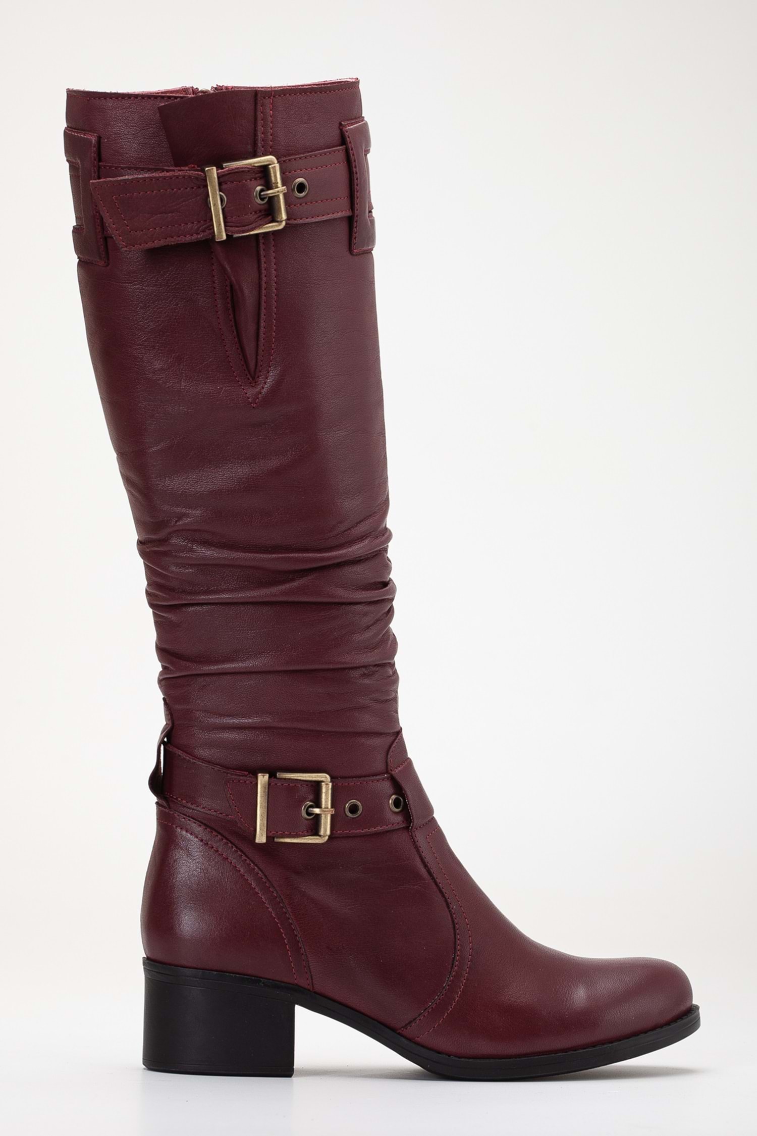 Kadın Hakiki Deri Körüklü Ayarlanabilir Tokalı Çizme - Bordo
