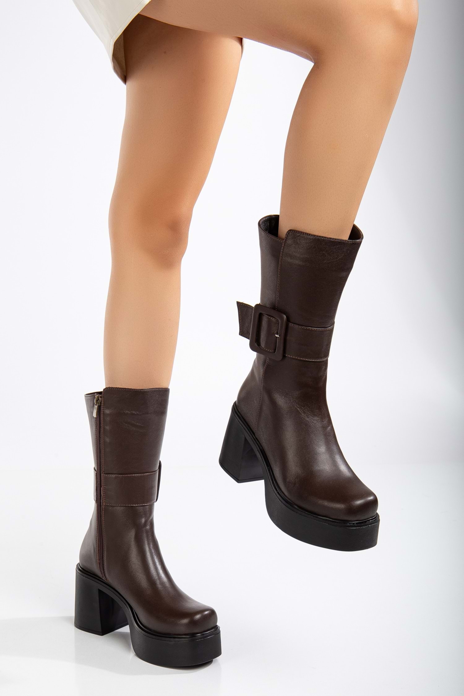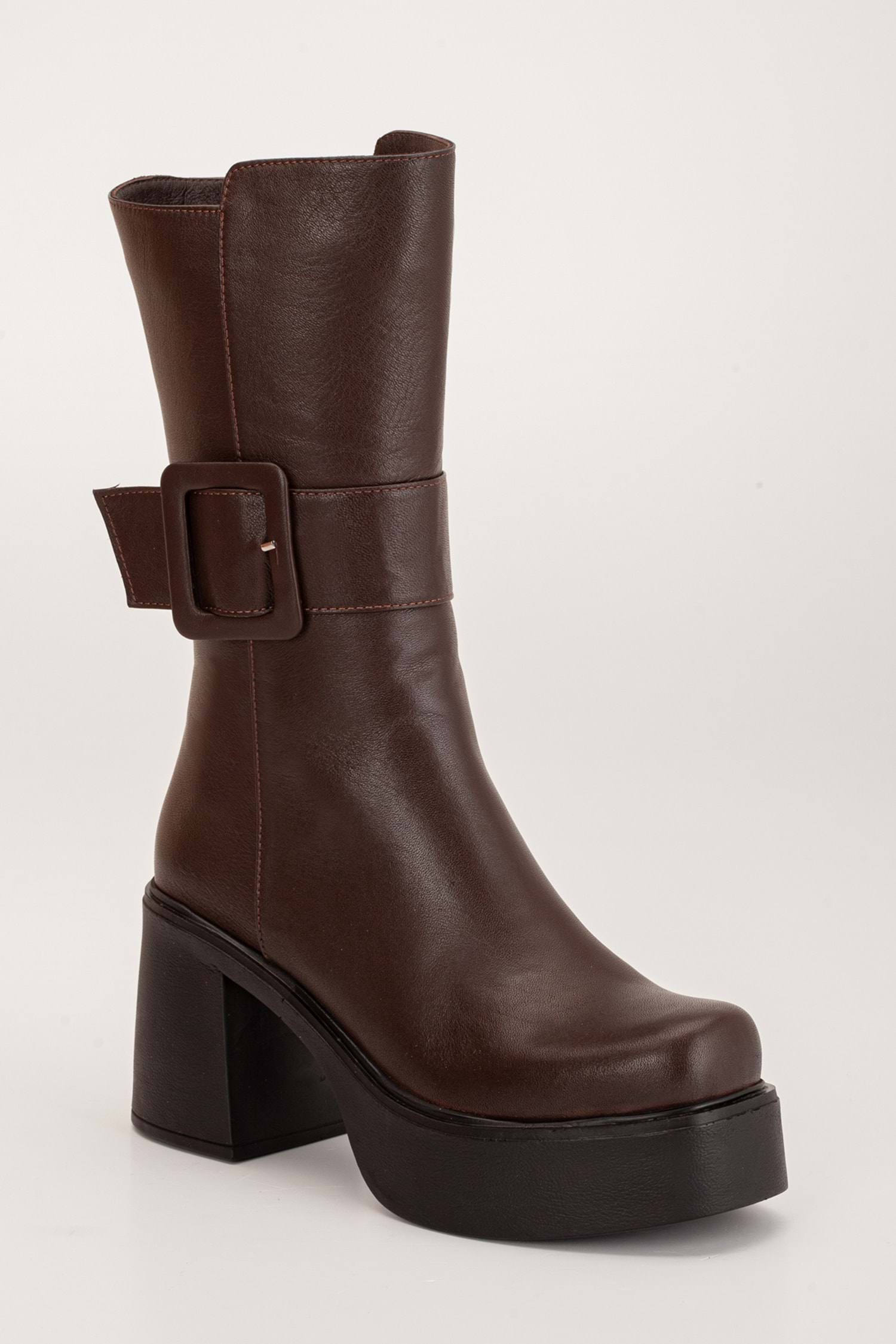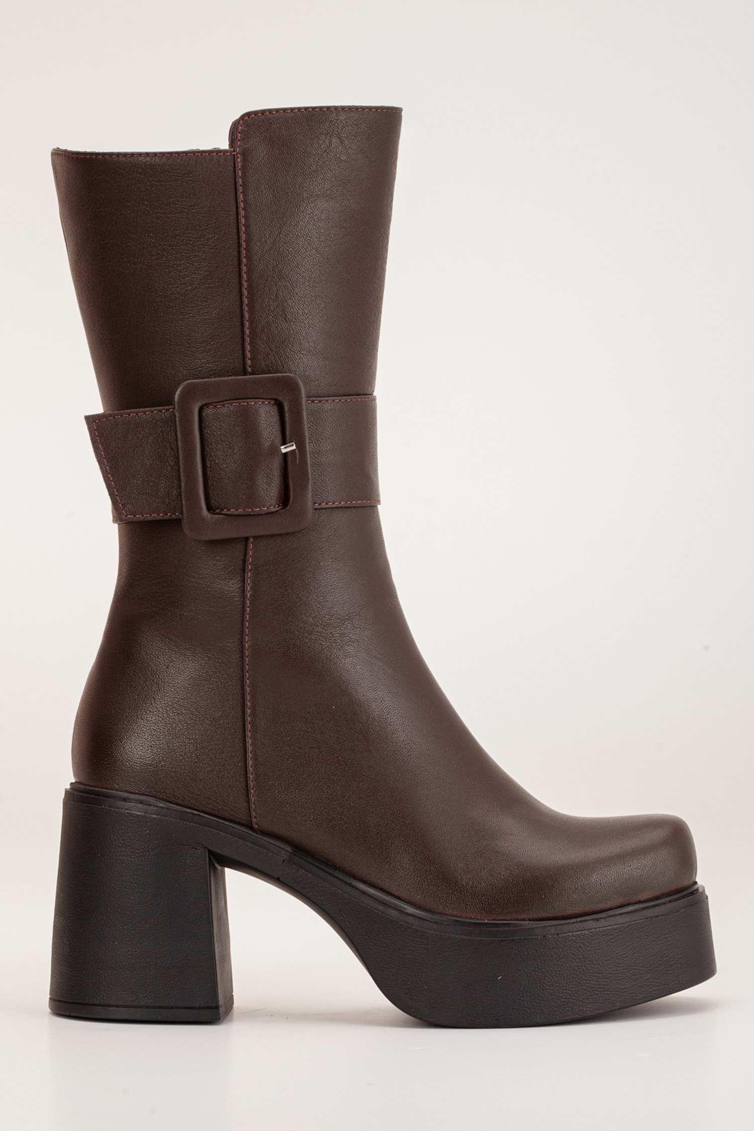 Kadın Hakiki Deri Tokalı Platformlu Kalın Topuklu Çizme - Kahve