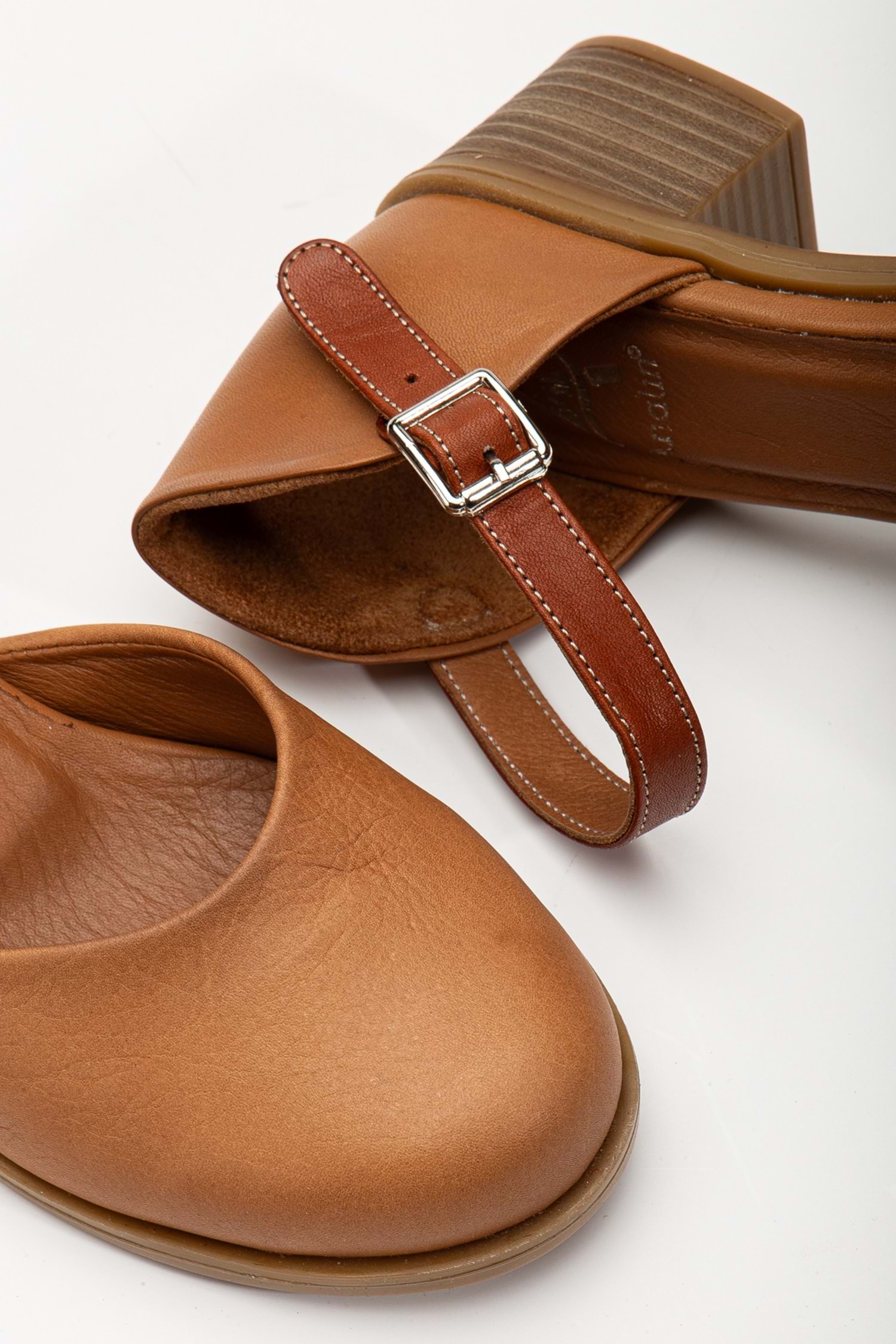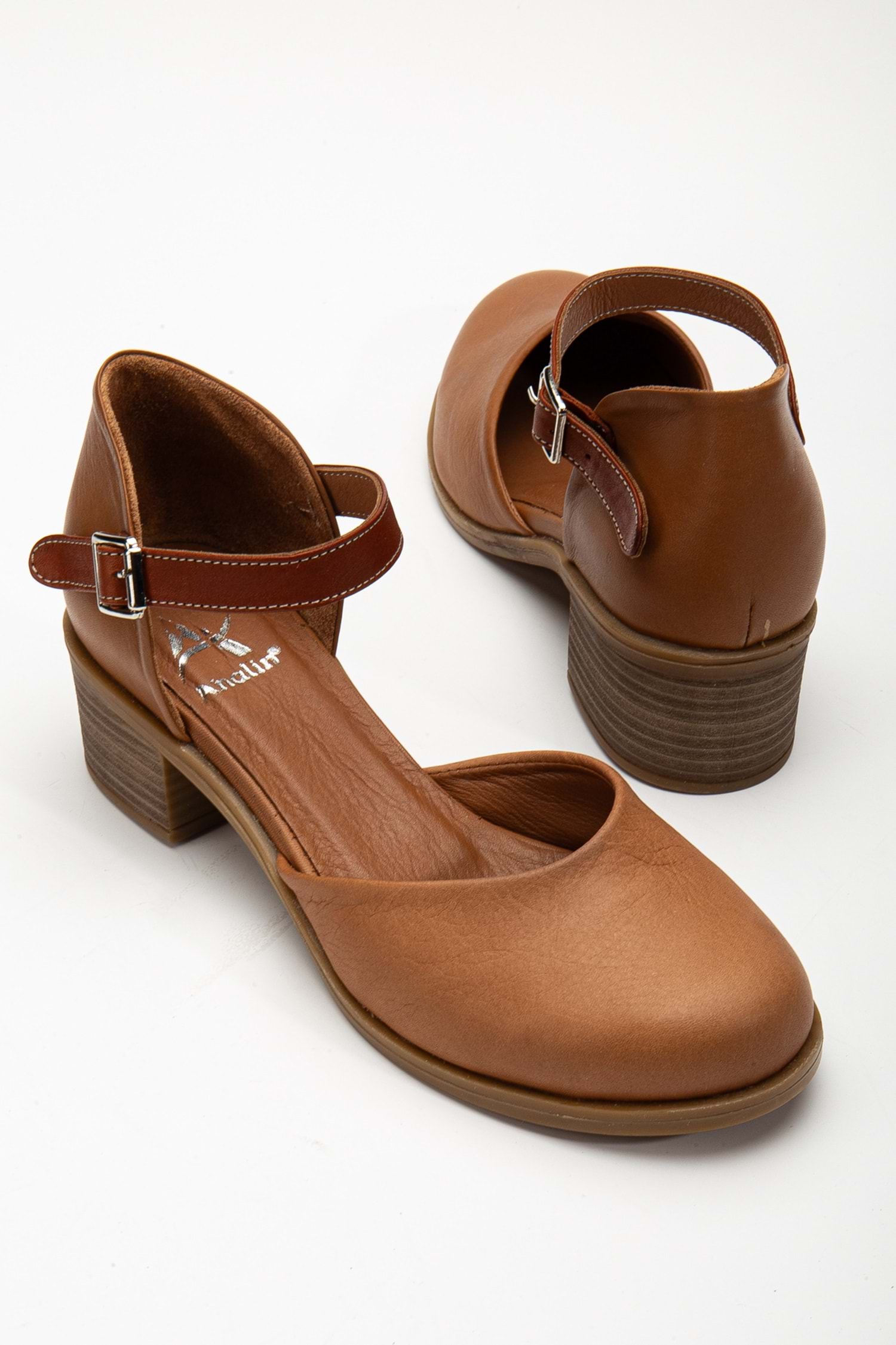 Kadın Hakiki Deri Burnu Kapalı Bilekten Bağlı Sandalet Taba