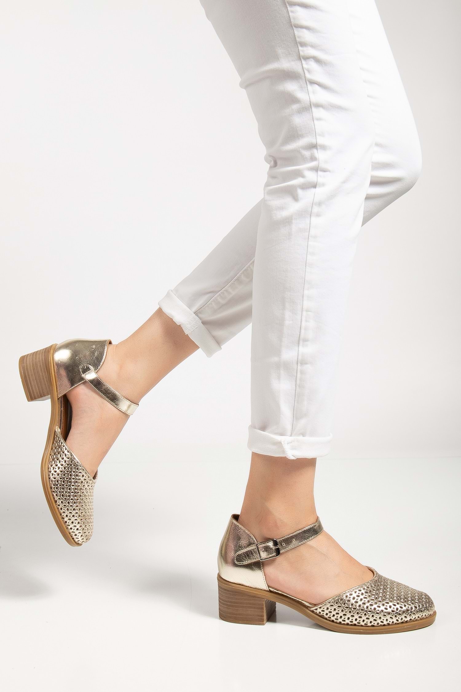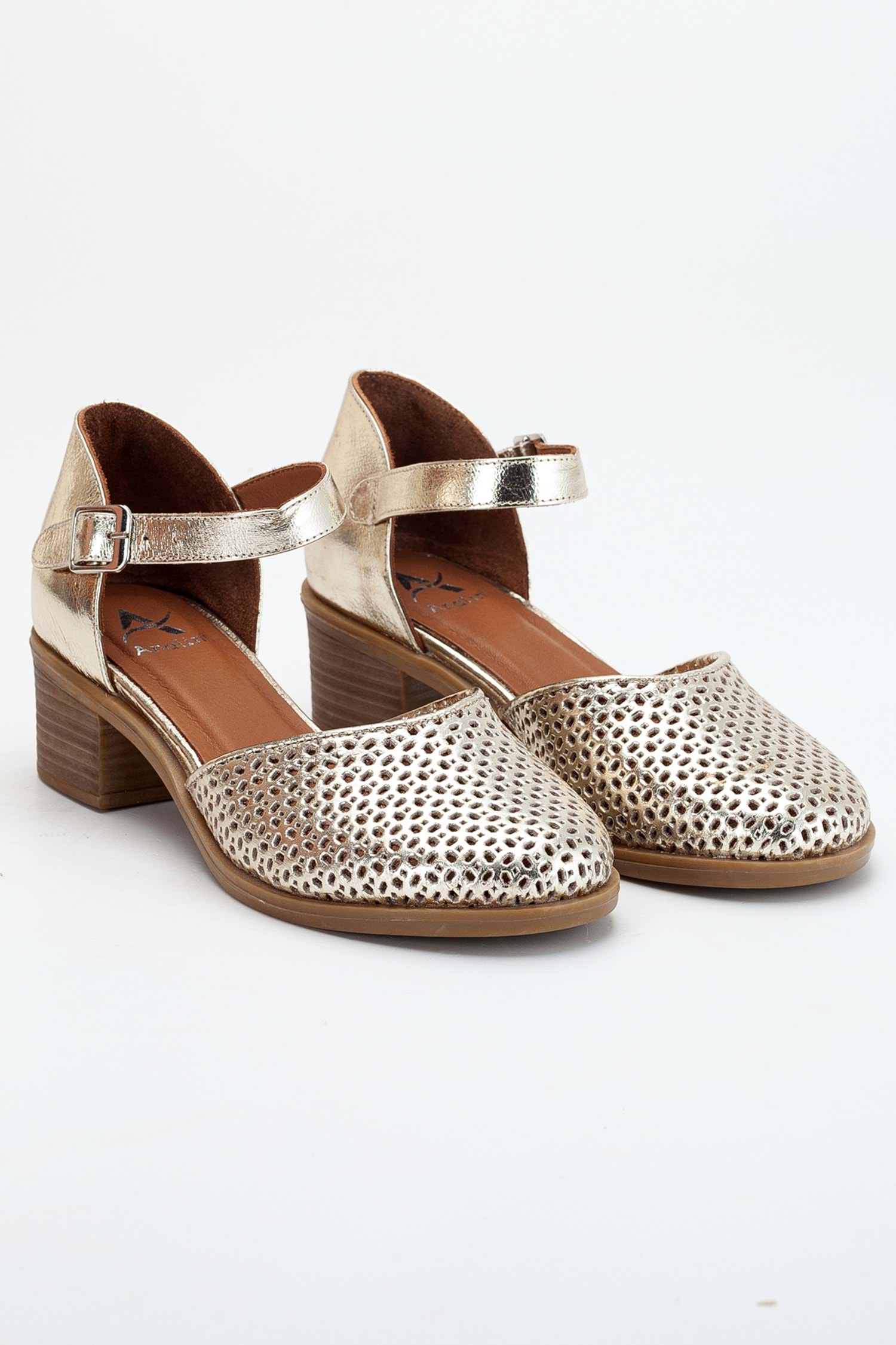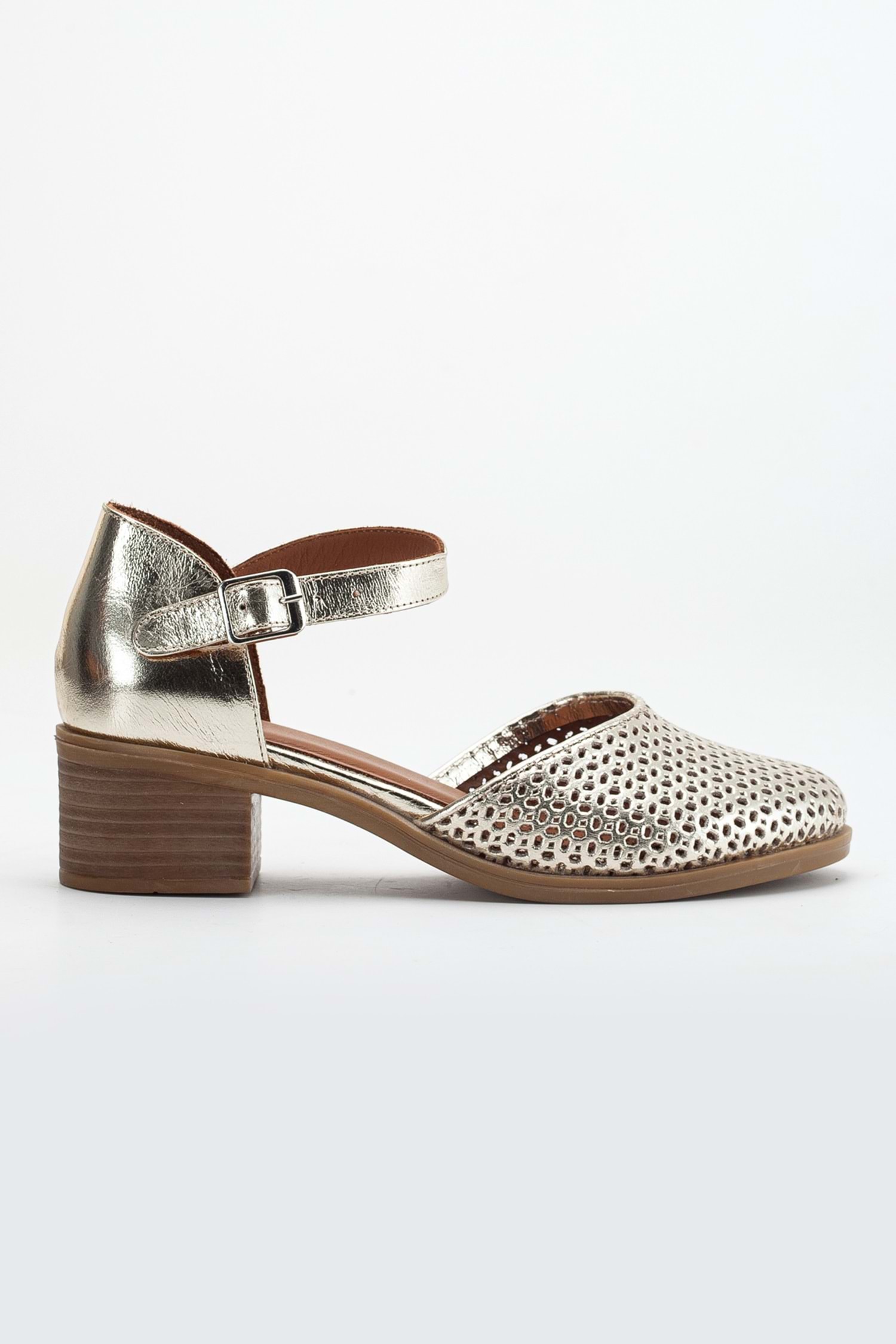 Kadın Hakiki Deri Burnu Kapalı Delikli Sandalet - Altın