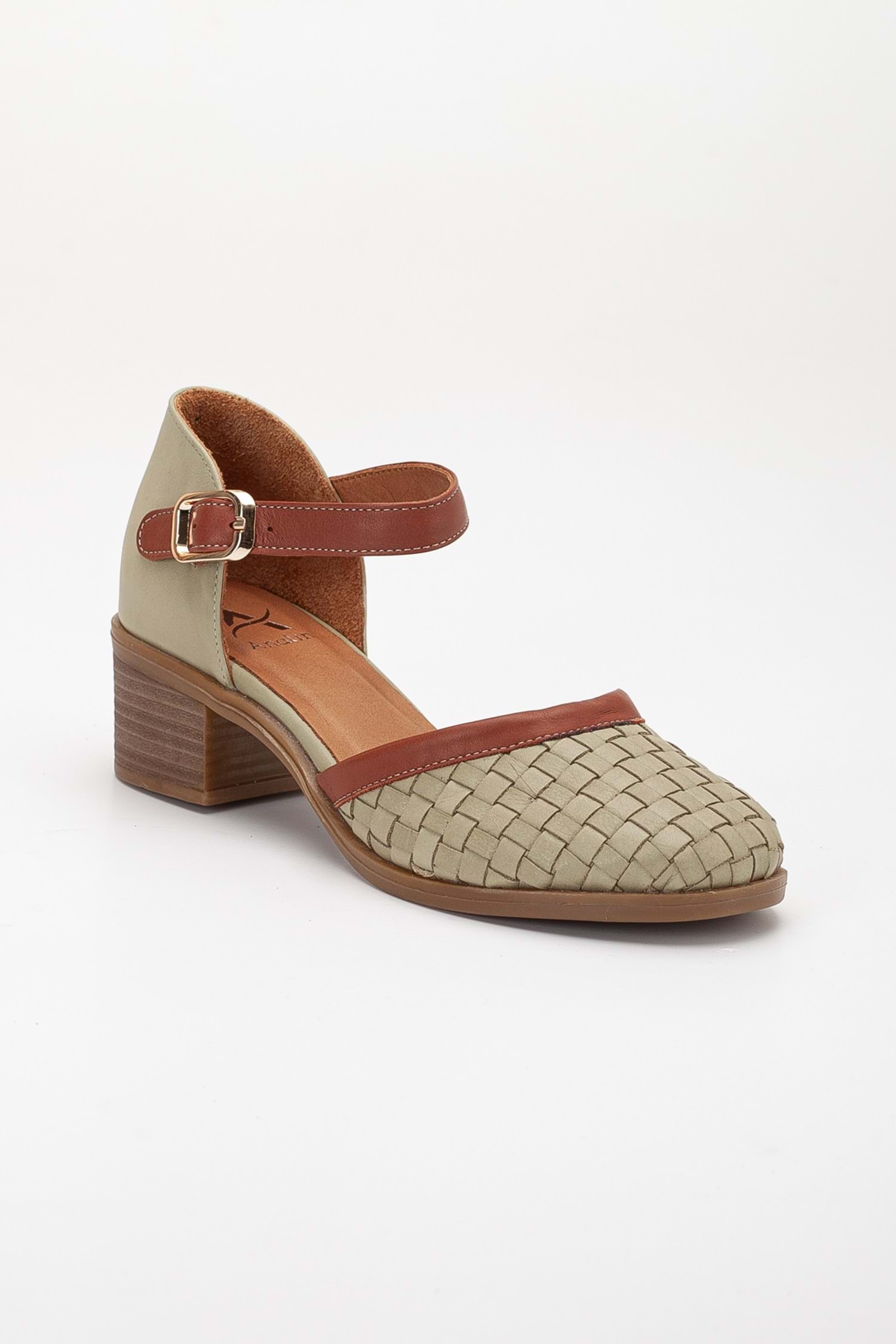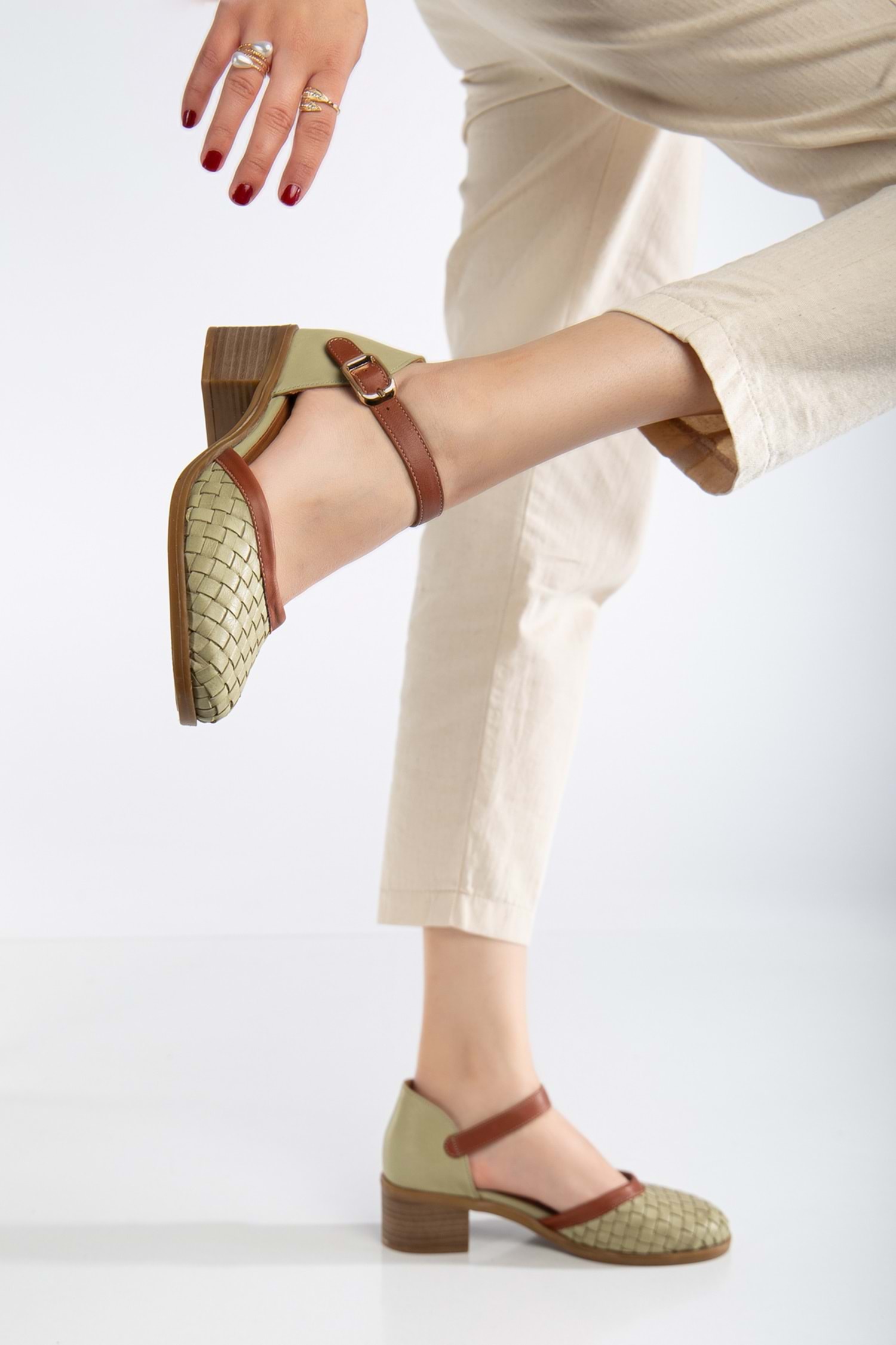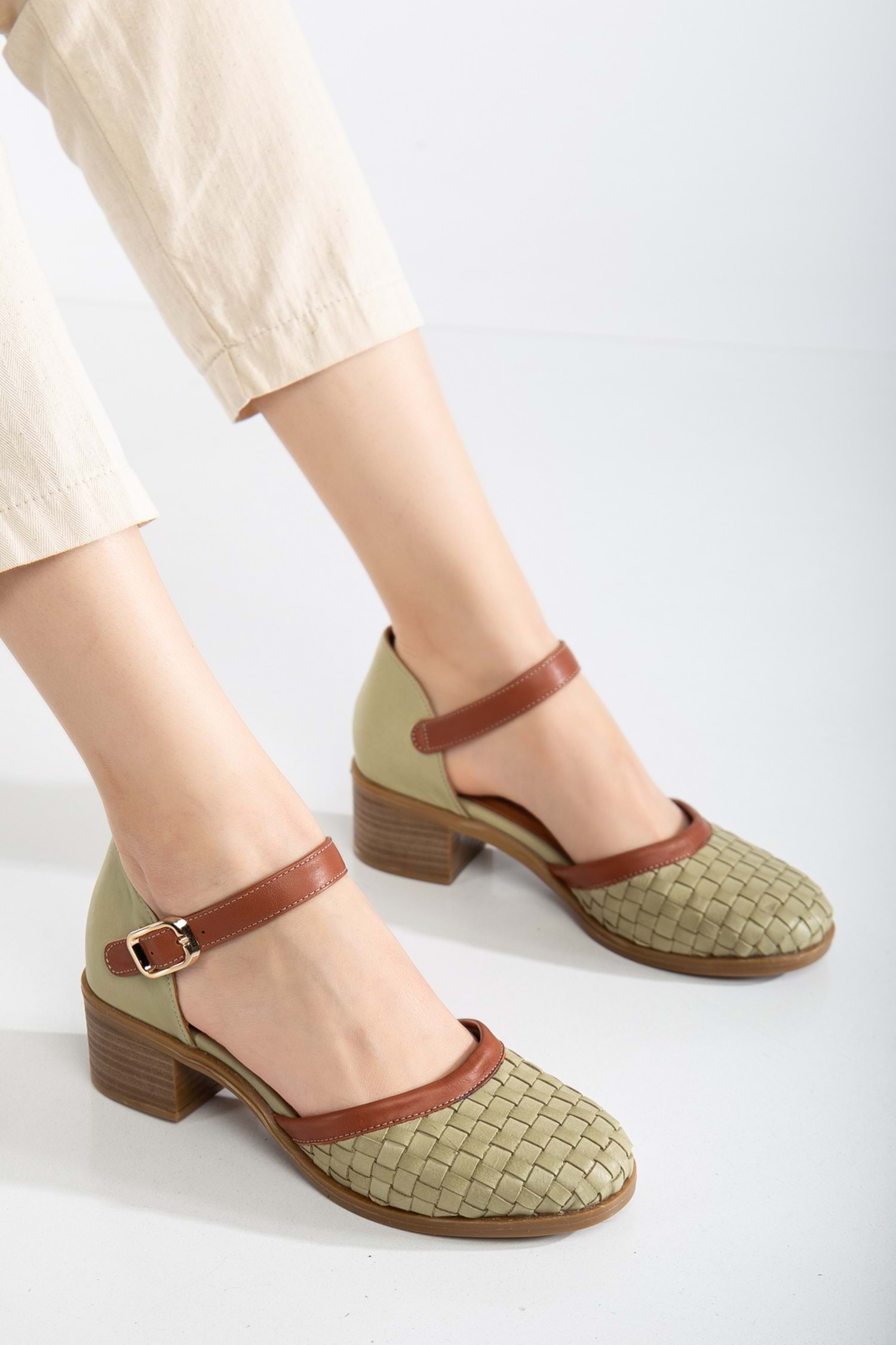 Kadın Hakiki Deri Burnu Kapalı Örgülü Sandalet - Yeşil