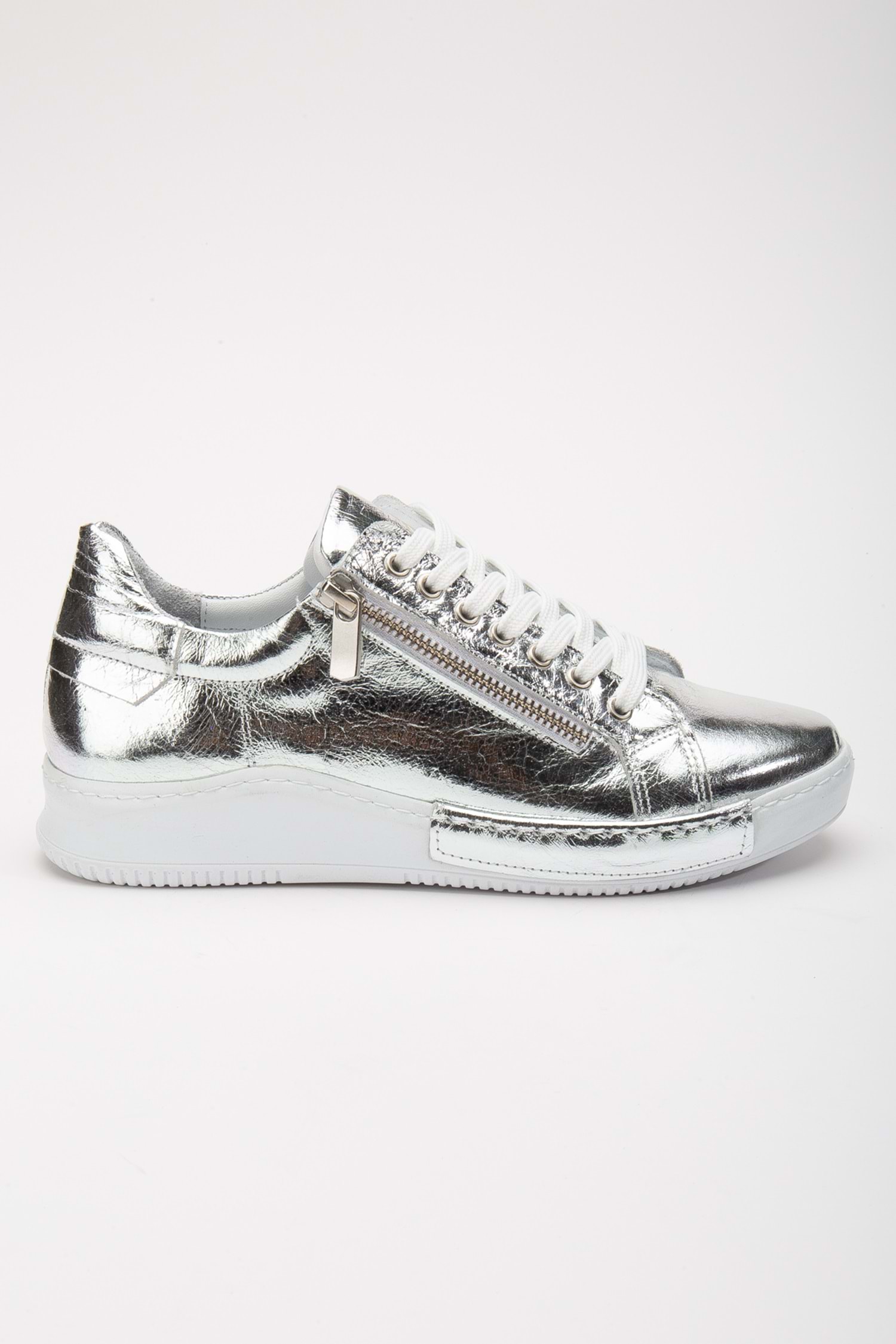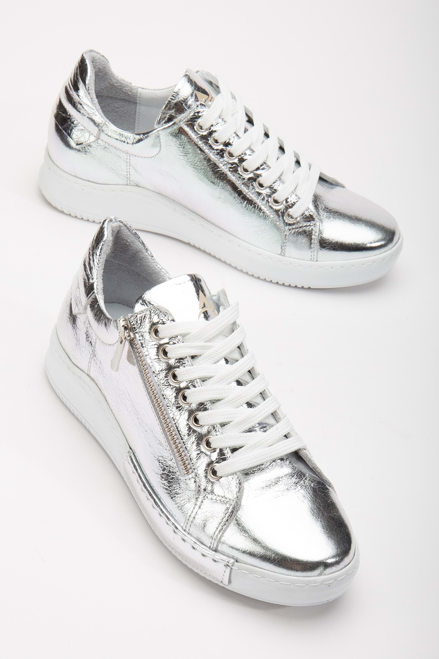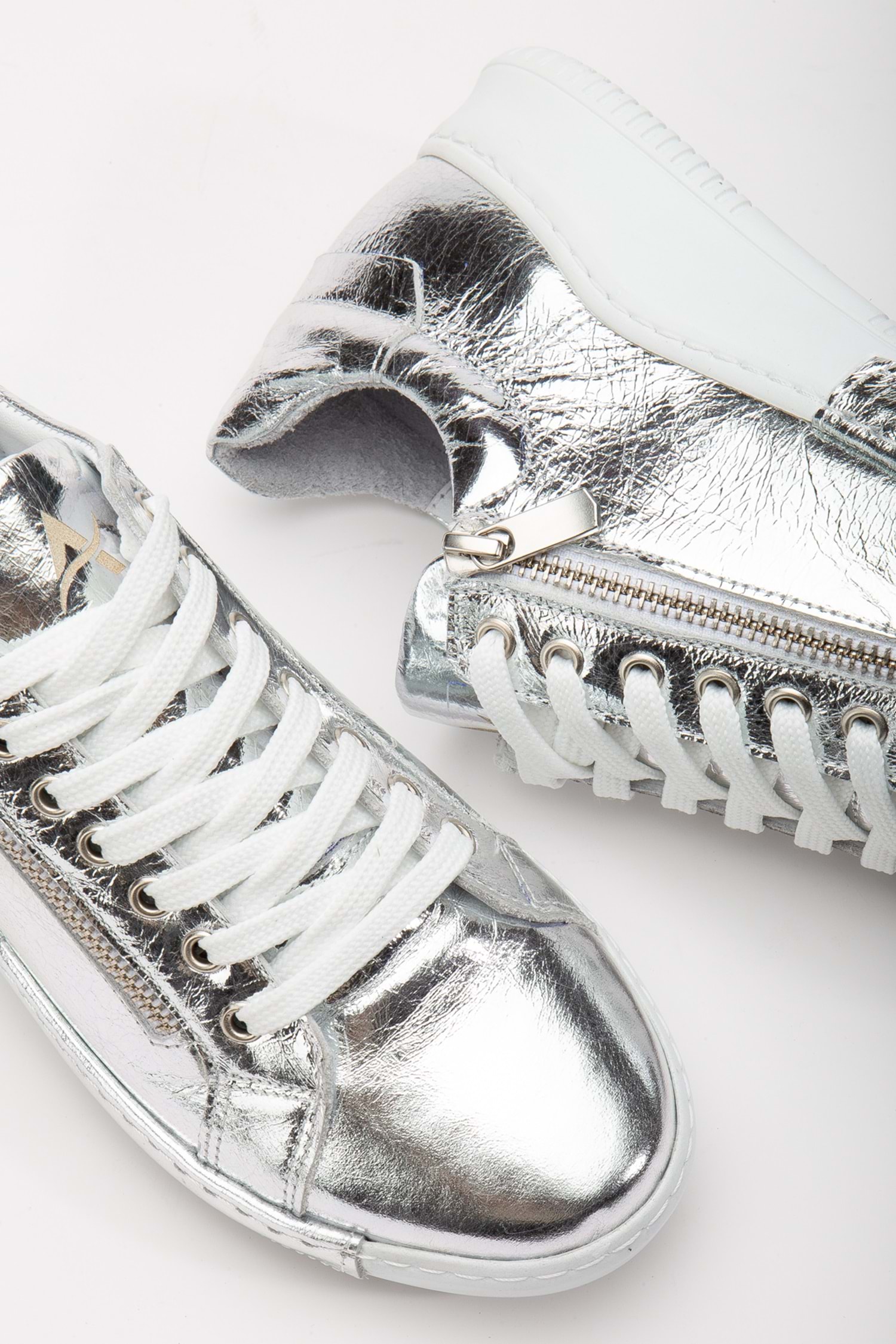 Kadın Hakiki Deri Fermuarlı Spor Ayakkabı Gümüş