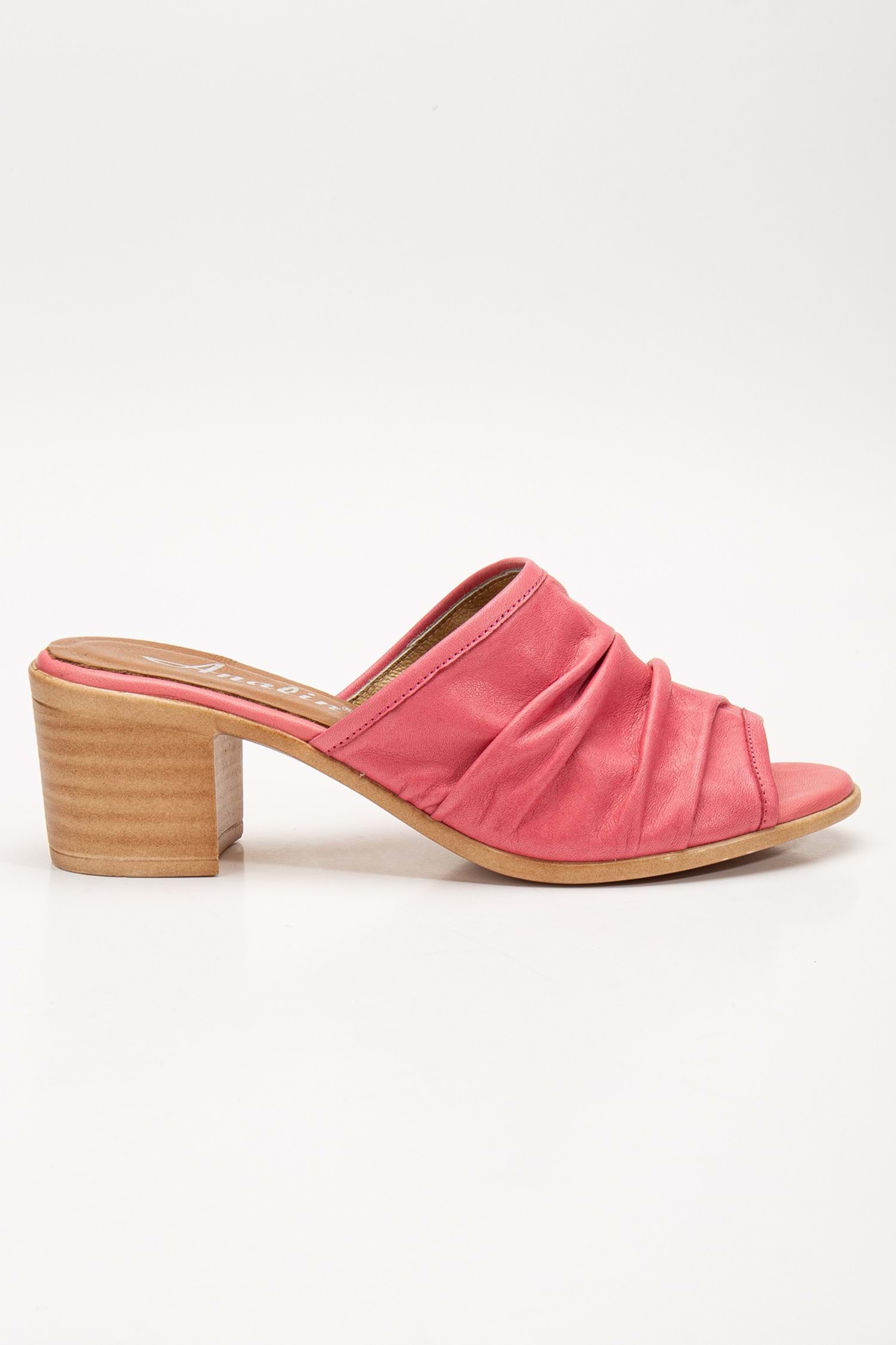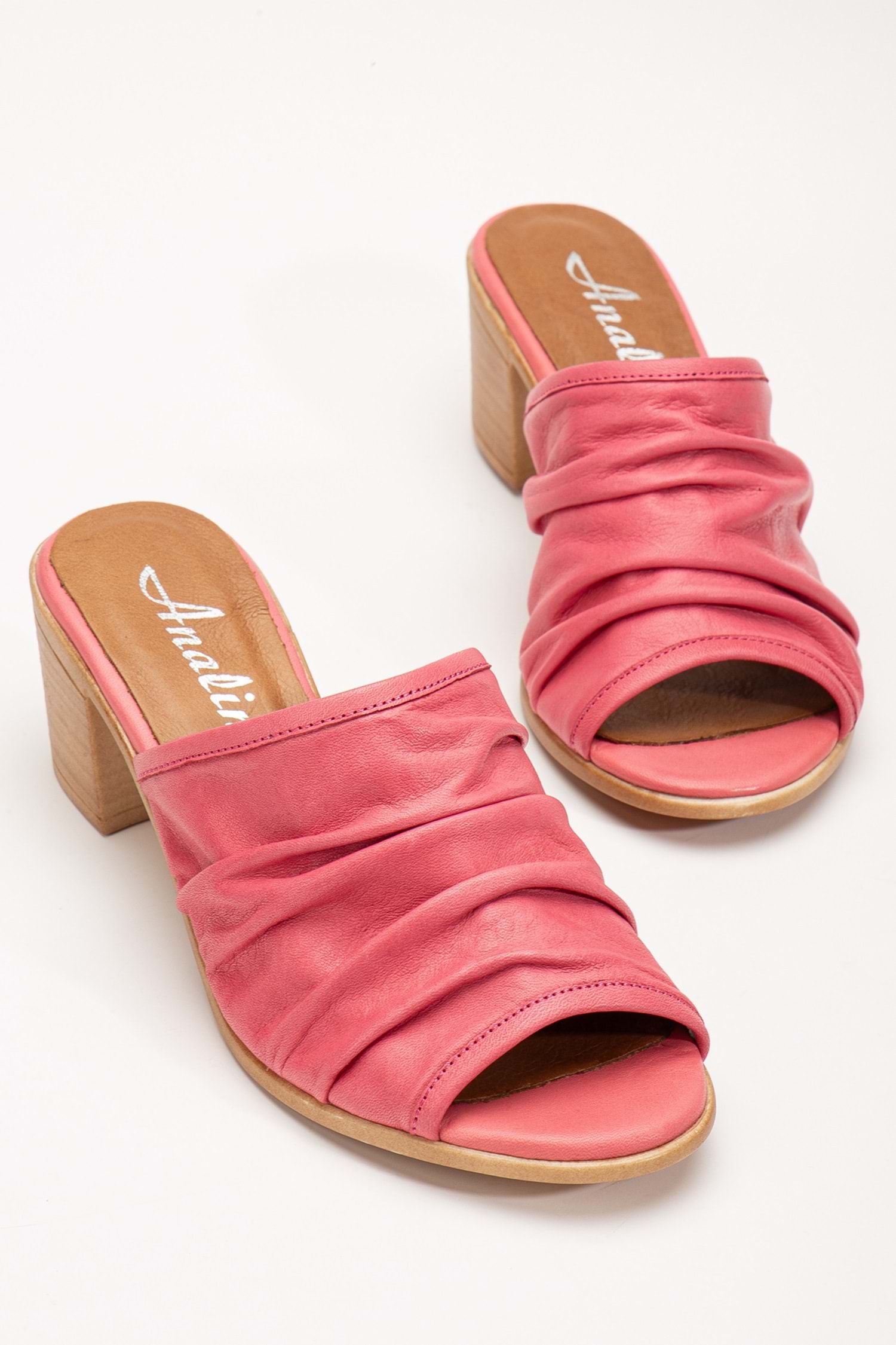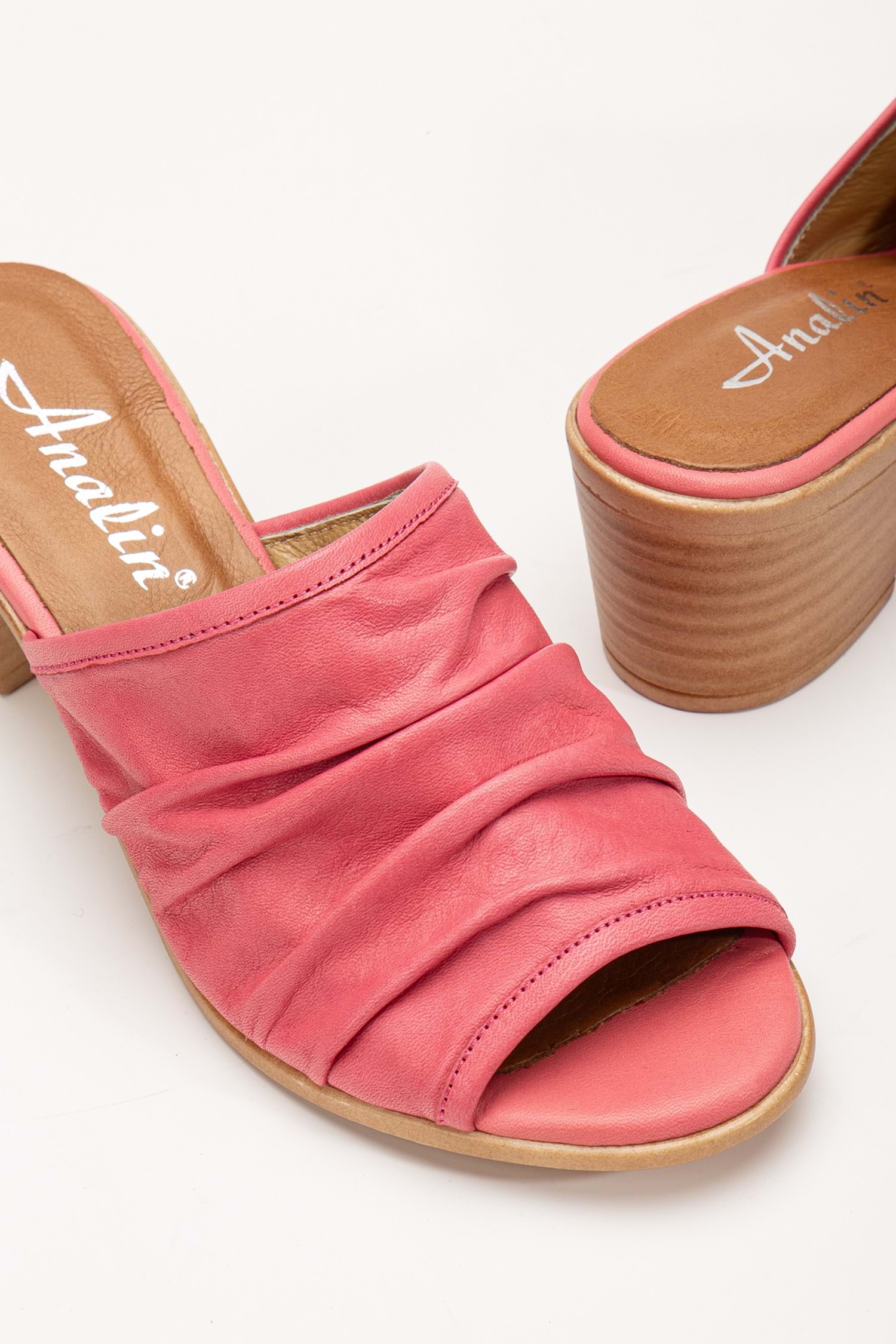 Kadın Hakiki Deri Kırışık Topuklu Terlik Pembe