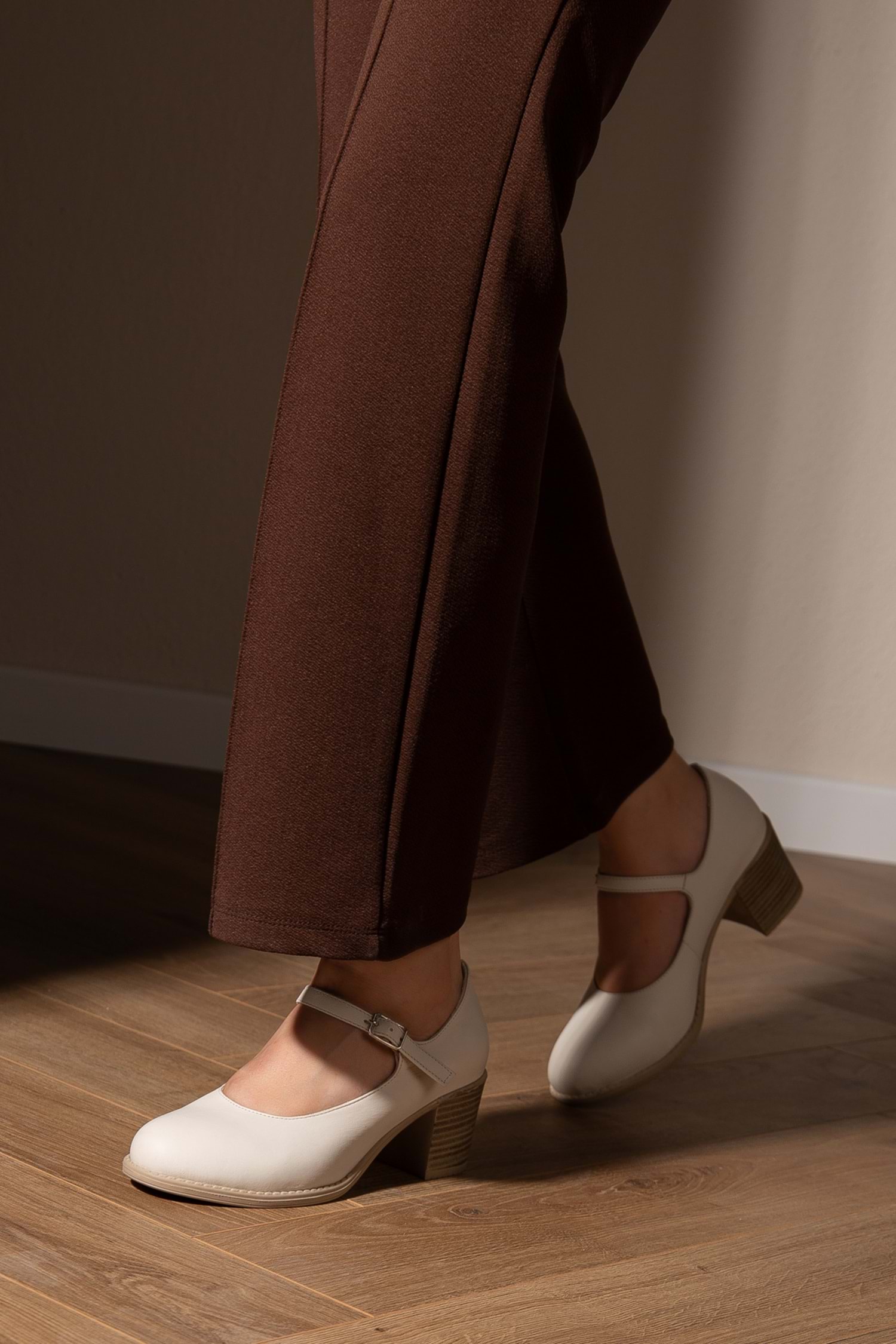 Kadın Hakiki Deri Bantlı Topuklu Ayakkabı - Krem