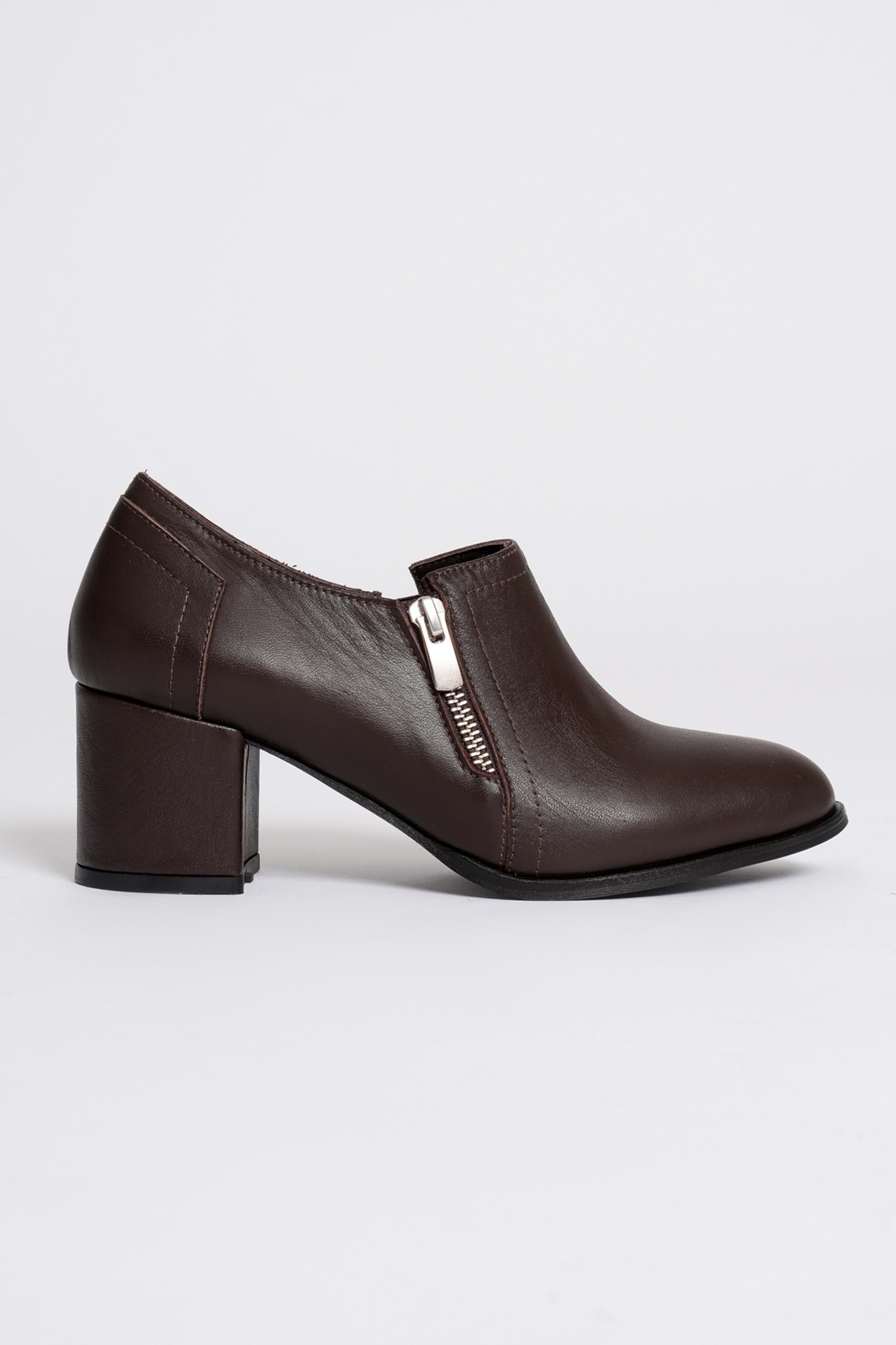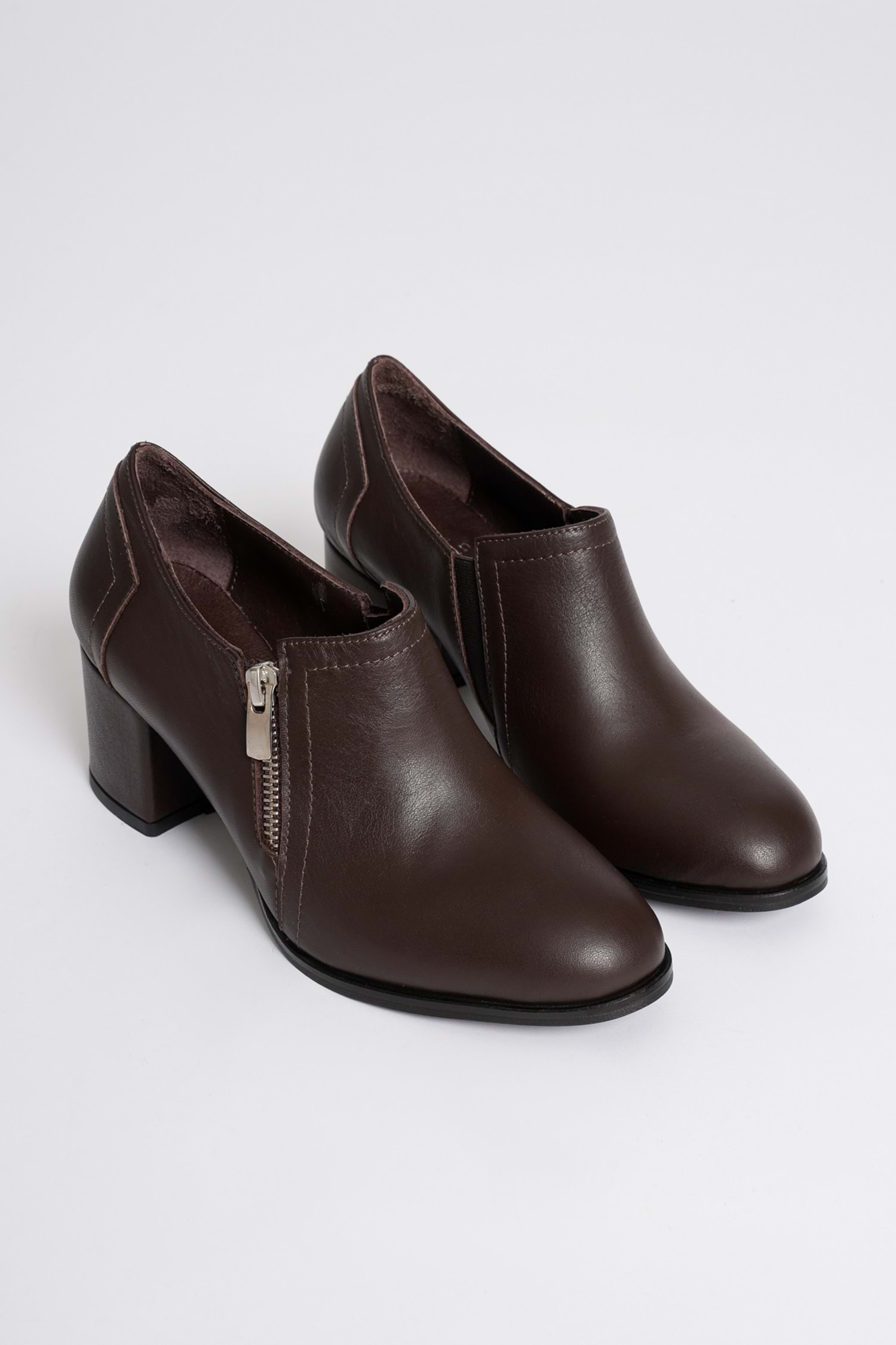 Kadın Hakiki Deri Fermuar Detaylı Şık Topuklu Ayakkabı - Kahve