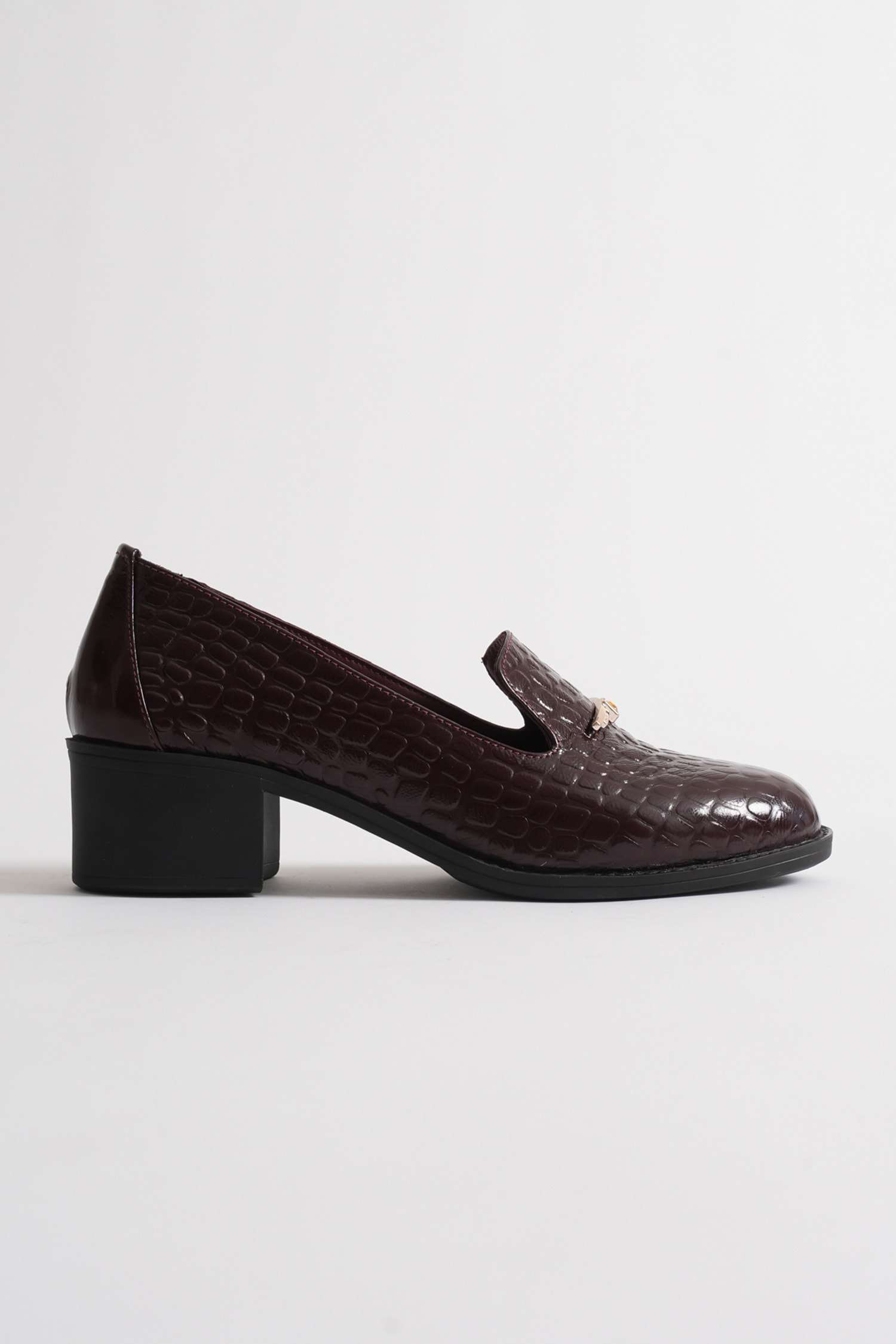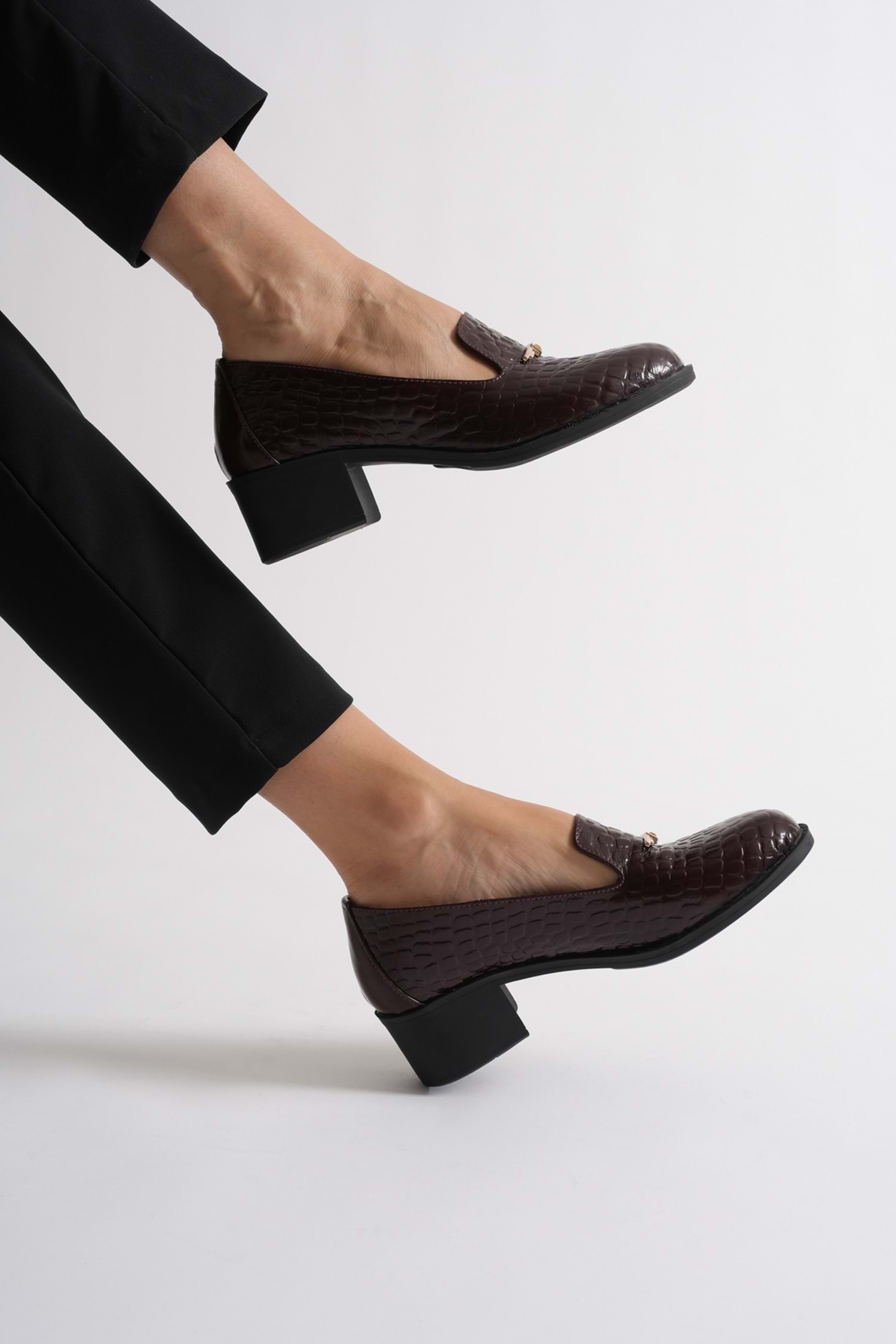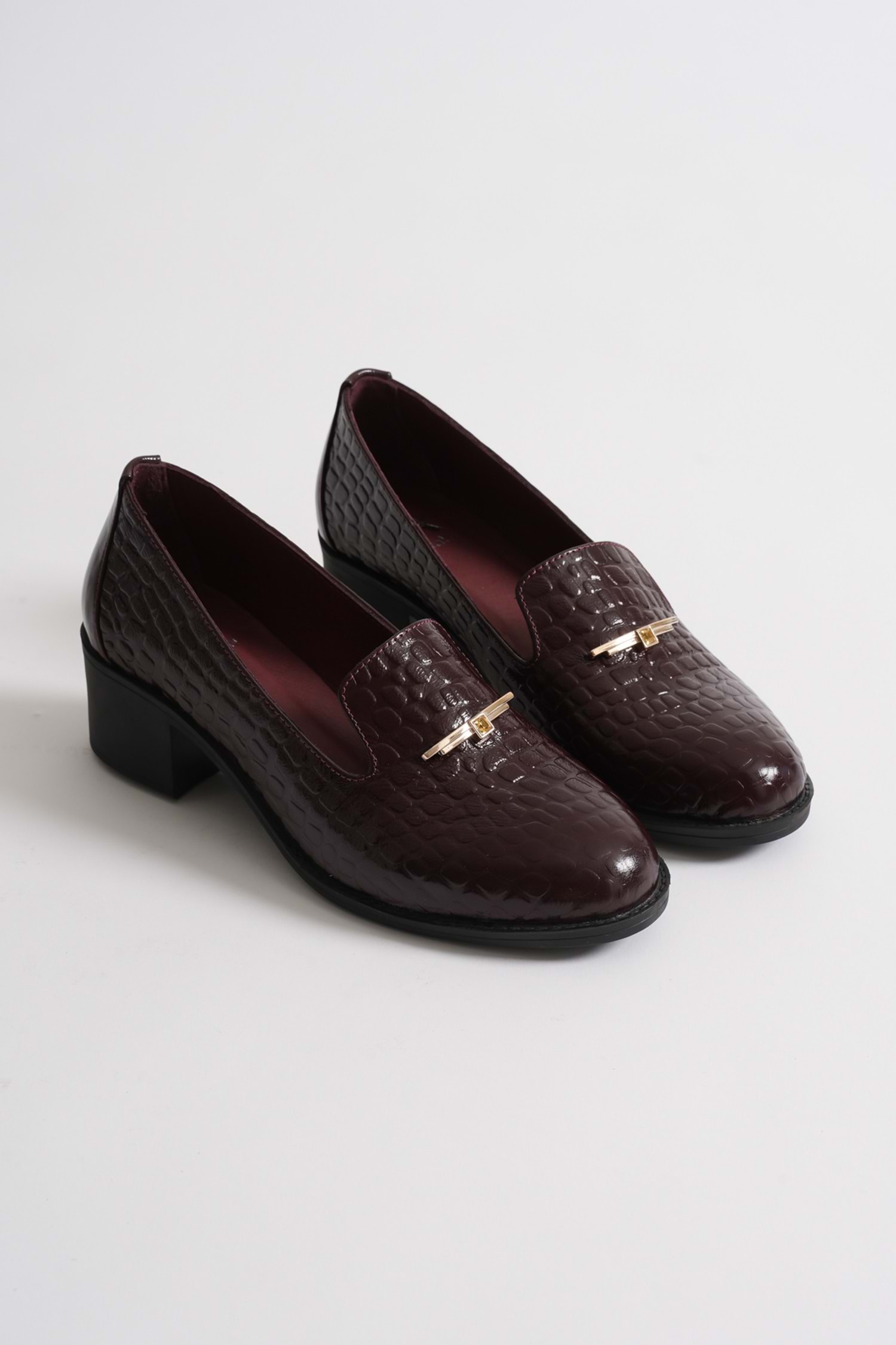 Kadın Hakiki Deri Kroko Baskılı Tokalı Topuklu Ayakkabı - Bordo Rugan