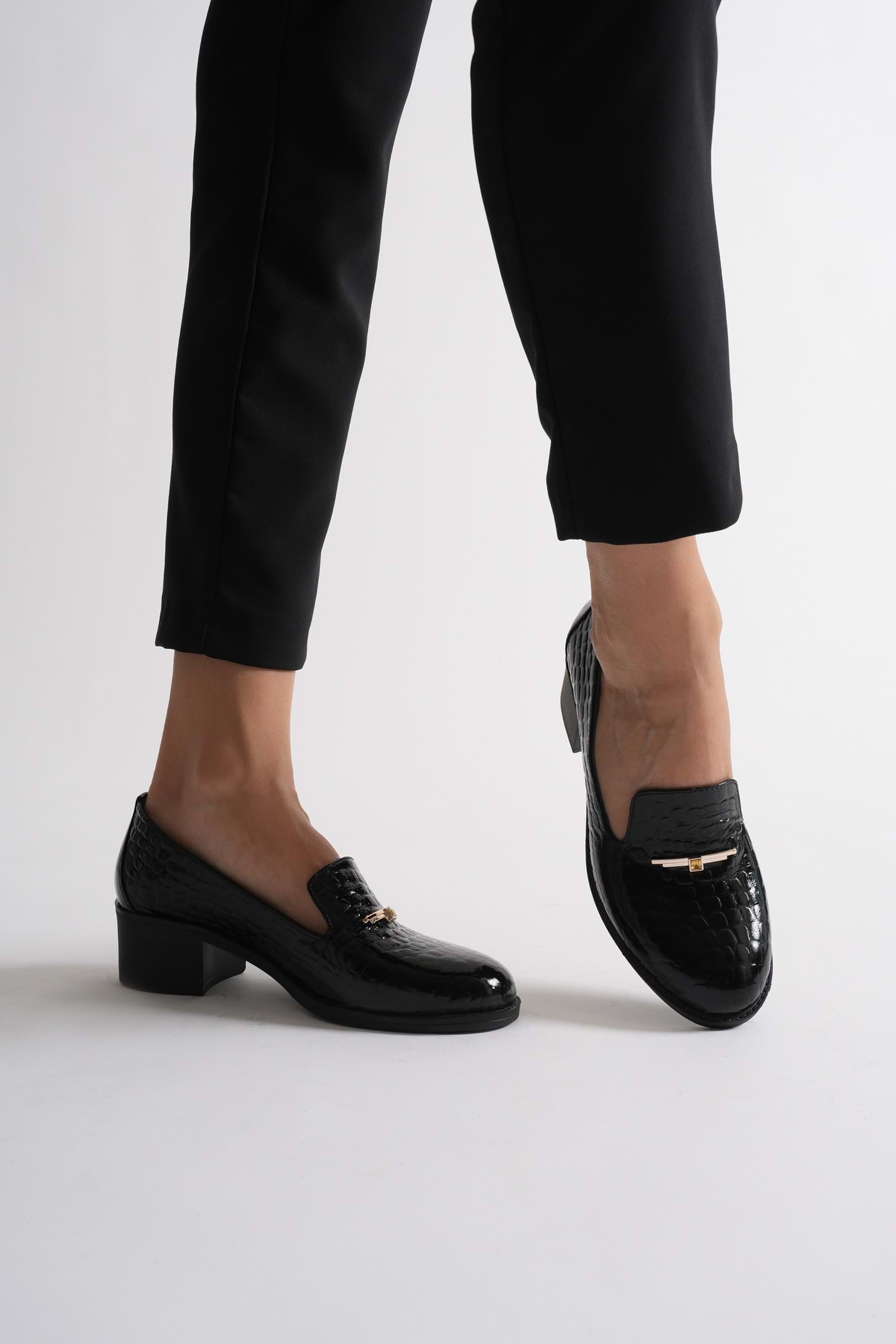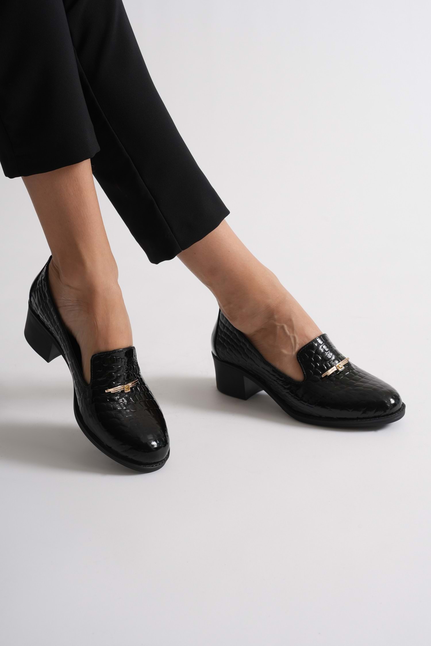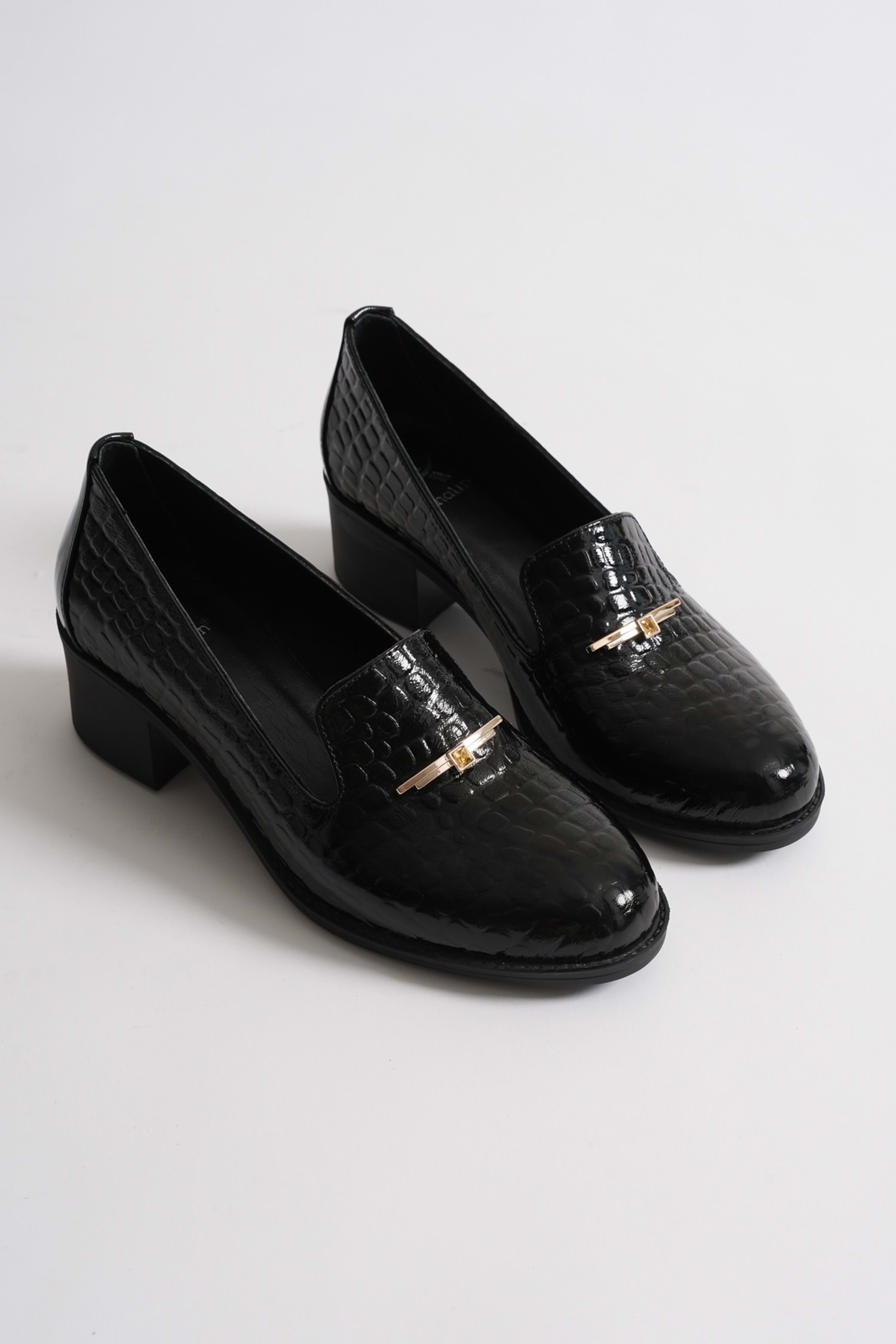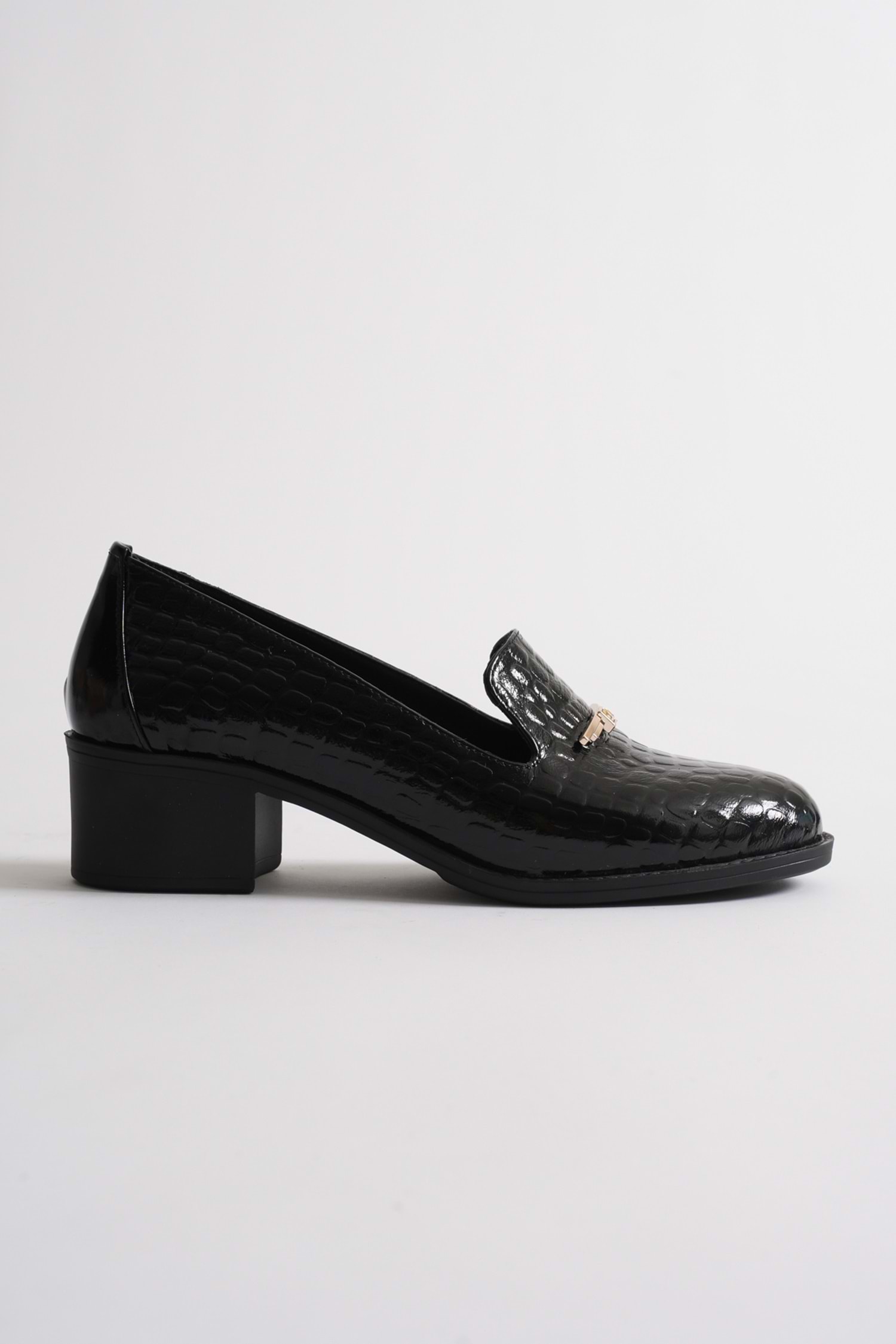 Kadın Hakiki Deri Kroko Baskılı Tokalı Topuklu Ayakkabı - Siyah Rugan