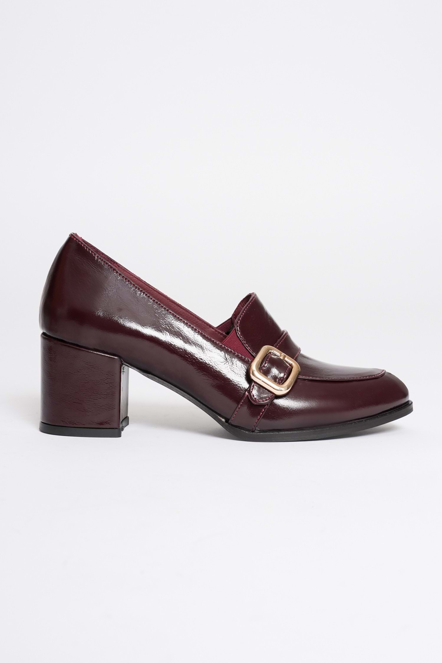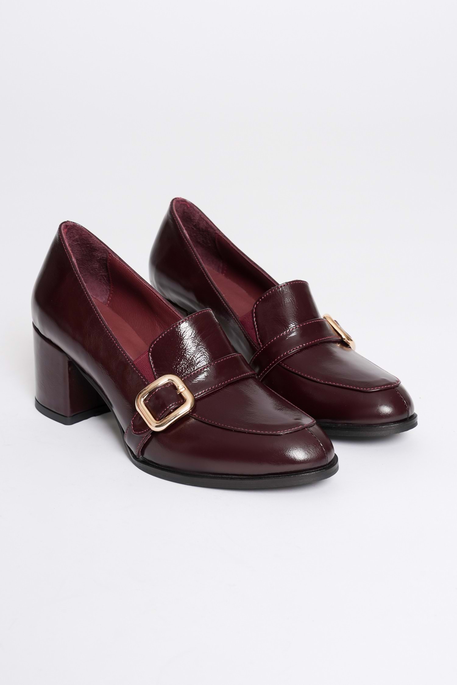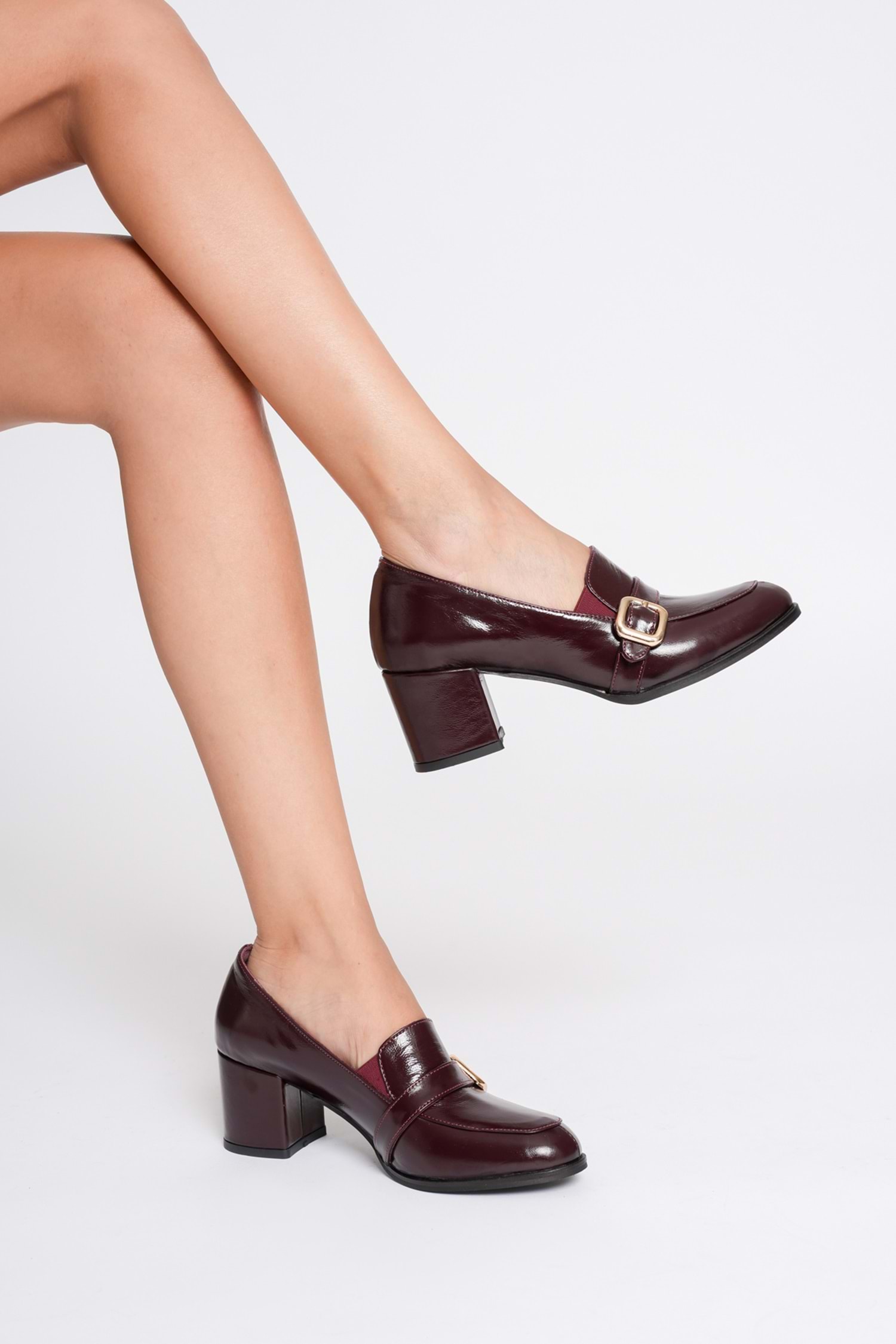 Kadın Hakiki Deri Toka Detaylı Topuklu Ayakkabı - Bordo Rugan
