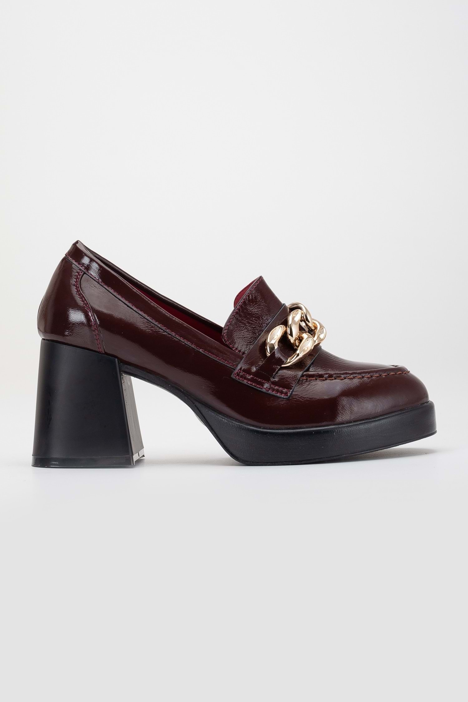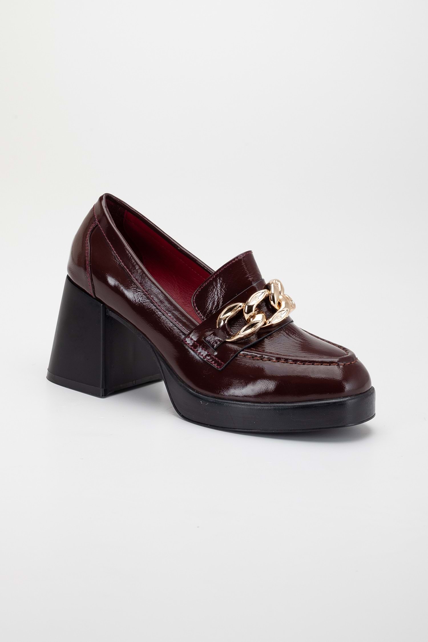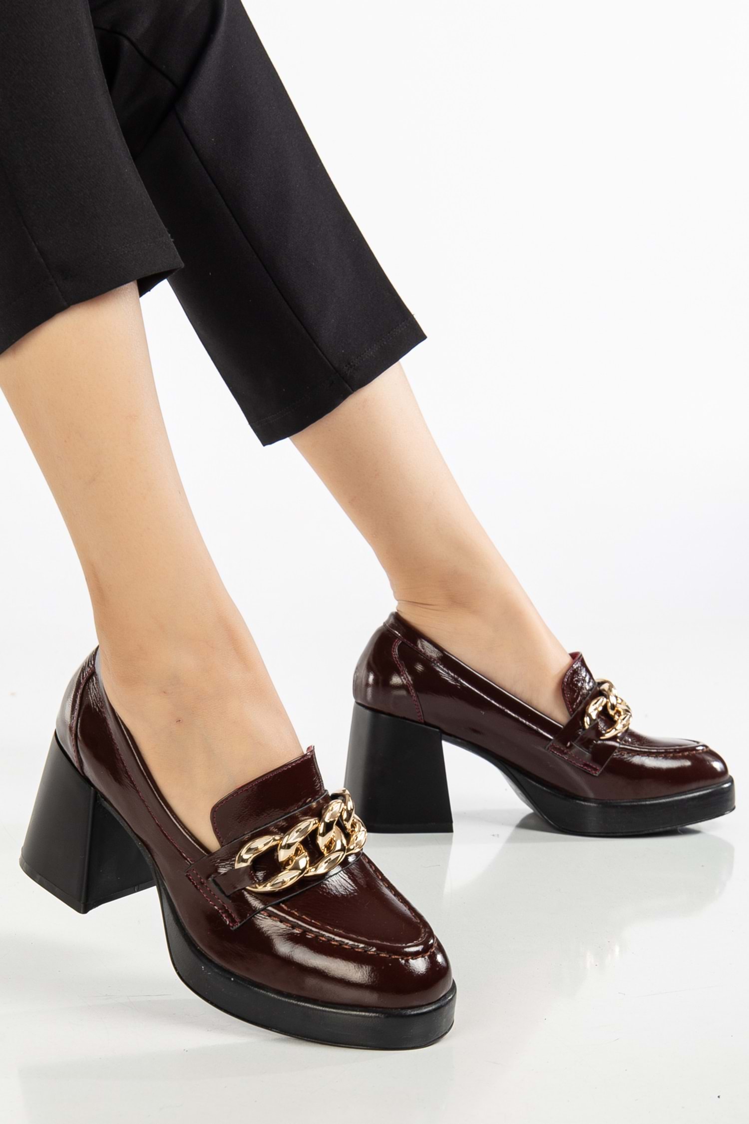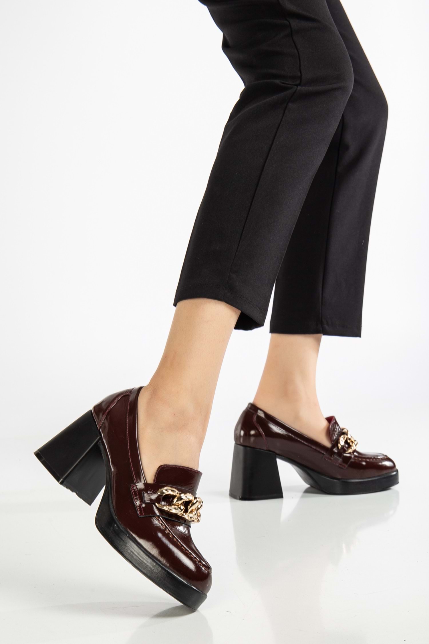 Kadın Hakiki Deri Tokalı Kalın Topuklu Ayakkabı - Bordo Rugan