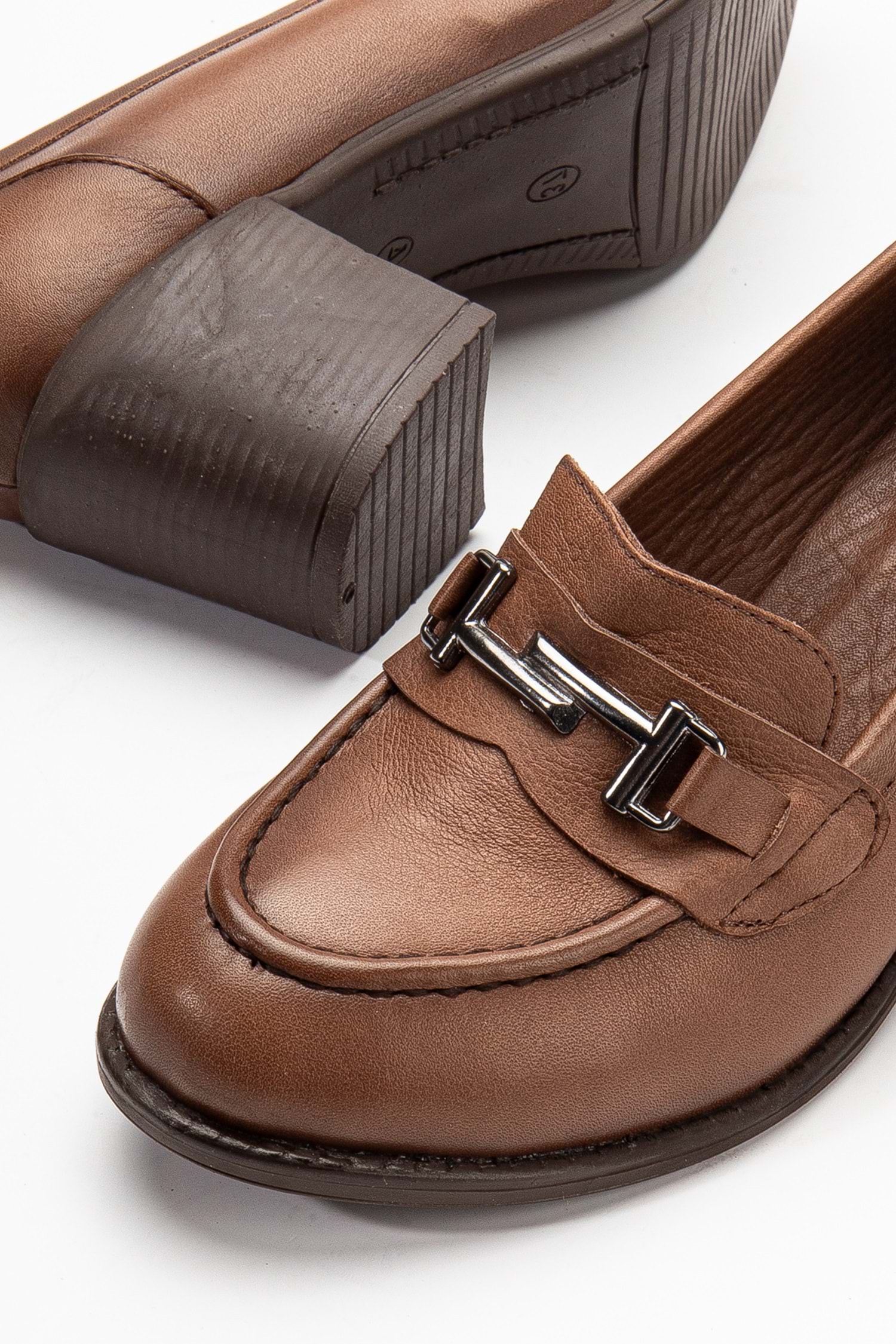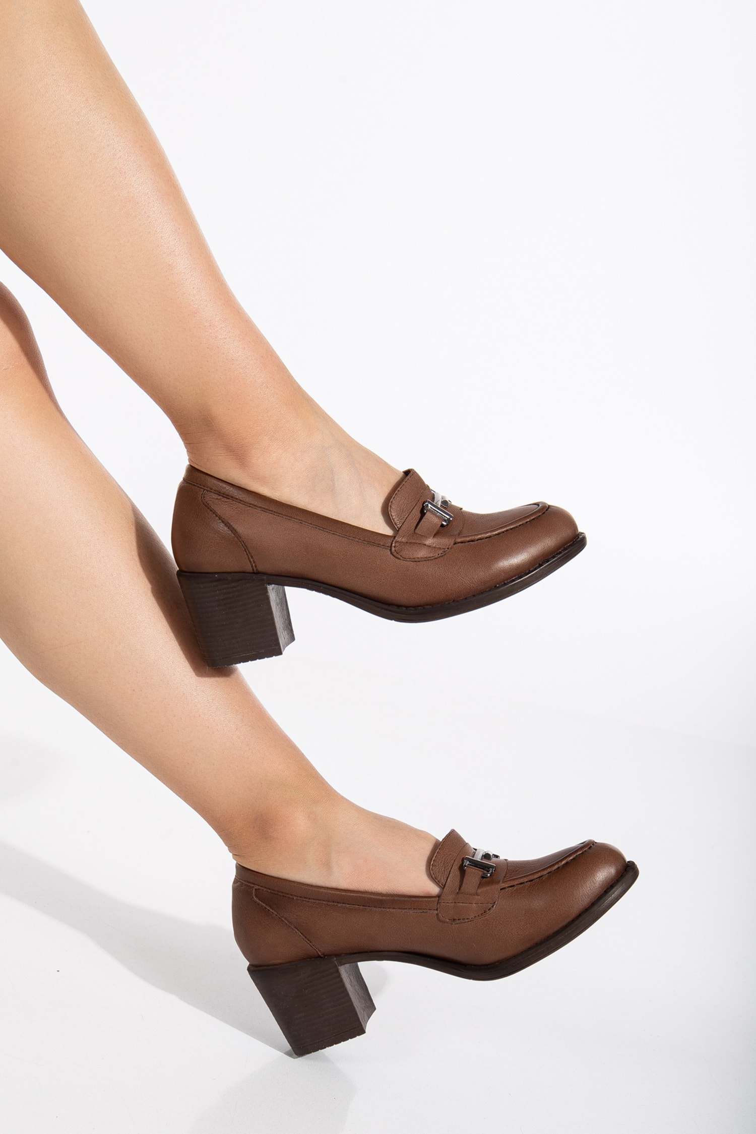Kadın Hakiki Deri Tokalı Klasik Topuklu Ayakkabı Ceviz