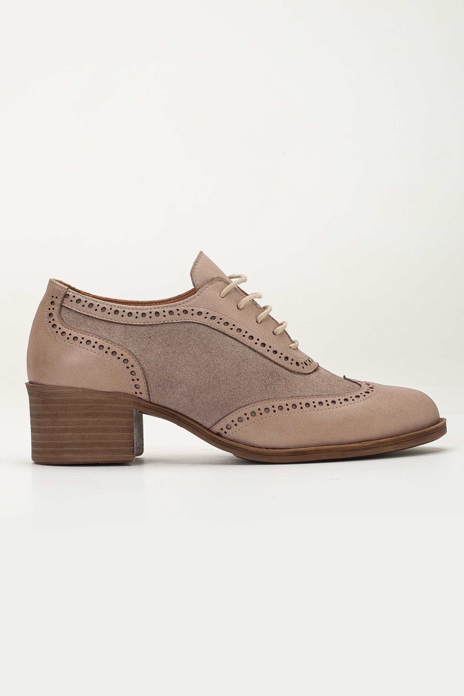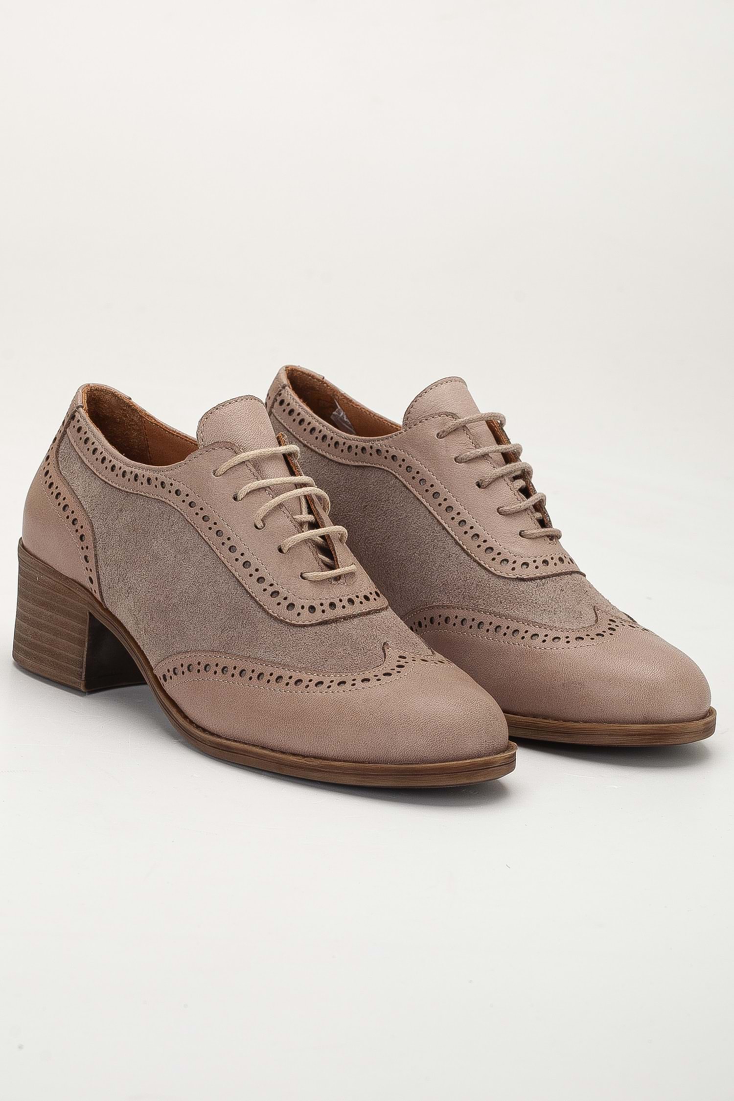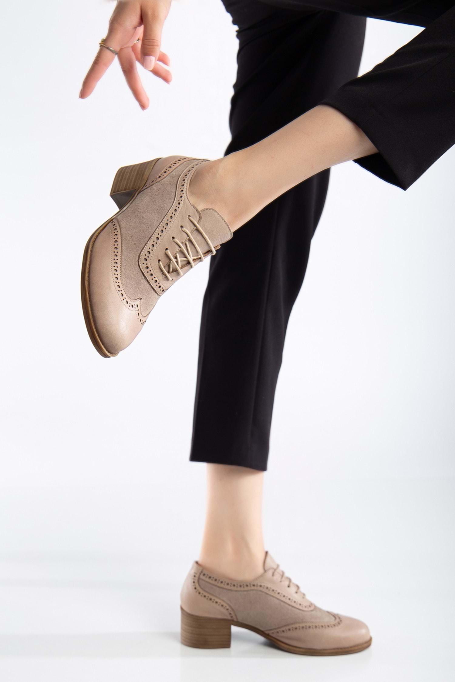 Kadın Hakiki Deri Topuklu Oxford Ayakkabı - Taş